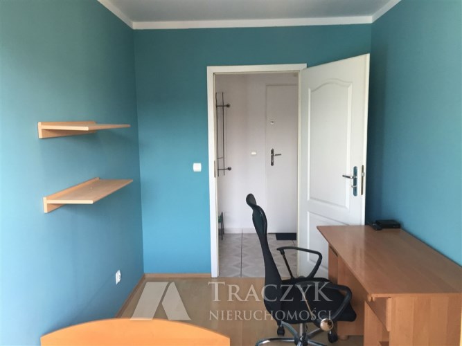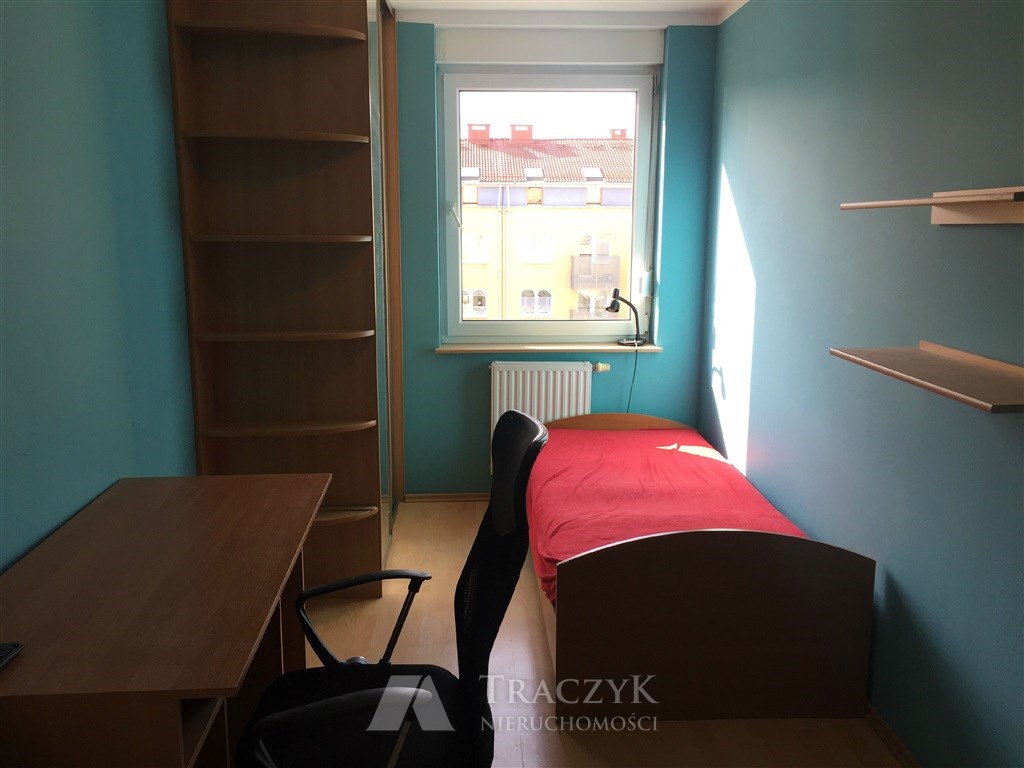 Pokój 2: łóżko jednoosobowe, szafa, biurko z krzesłem.