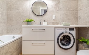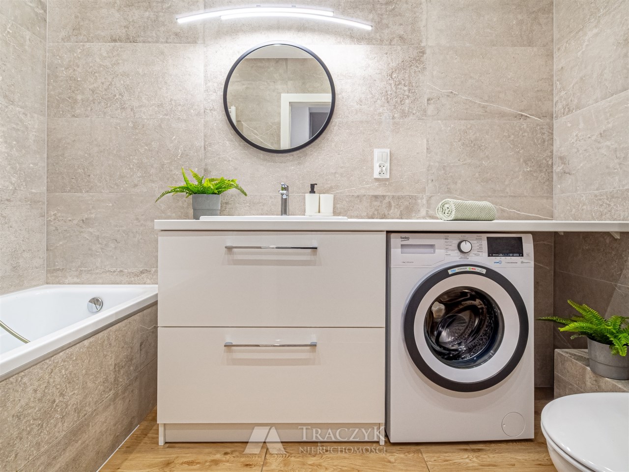 • łazienka w szafki do przechowywania, wannę z prysznicem, umywalkę, lustro, pralkę oraz toaletę,