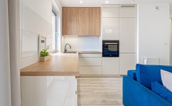 • aneks kuchenny w meble w zabudowie (wszystko dopełnia nowoczesny sprzęt AGD - lodówko zamrażarka, piekarnik elektryczny, płyta indukcyjna, okap kuchenny, zmywarka),