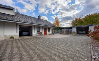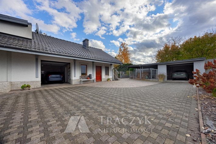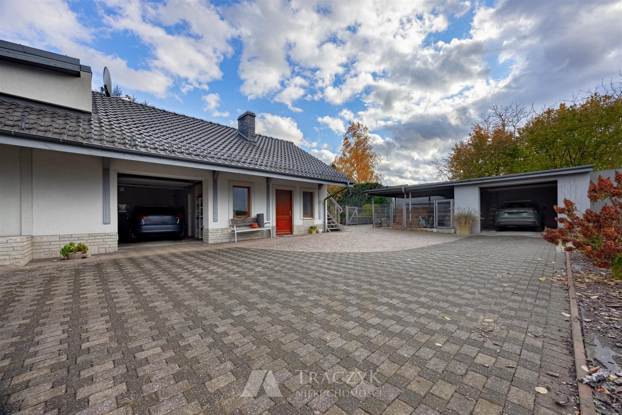 Posesja w całości ogrodzona, podjazd i ścieżki wybrukowane kostką brukową.