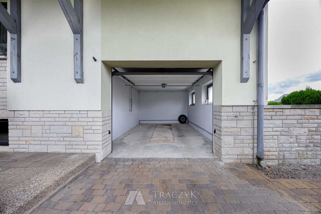 Przy parterowym znajduje się także budynek gospodarczy w zwartej zabudowie mieszczący garaż oraz pomieszczenie gospodarcze. Osobno na działce znajduje się również budynek gospodarczy mieszczący kolejny garaż, dwa pomieszczenia gospodarcze oraz kojec dla psa.