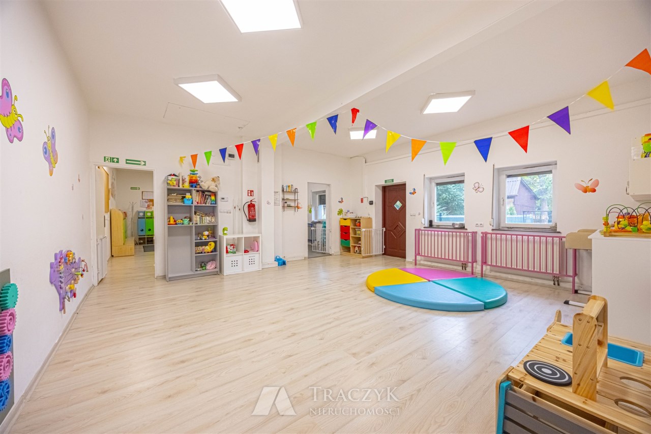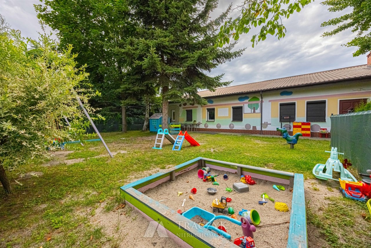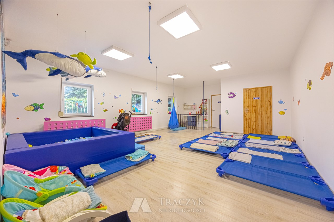 Nieruchomość dodatkowo oferuje osobny budynek usługowy o powierzchni 128 m², w którym obecnie funkcjonuje żłobek — istnieje możliwość kontynuacji współpracy w ramach obecnej umowy najmu, co stanowi atrakcyjną opcję dla inwestorów poszukujących gotowego źródła dochodu.
