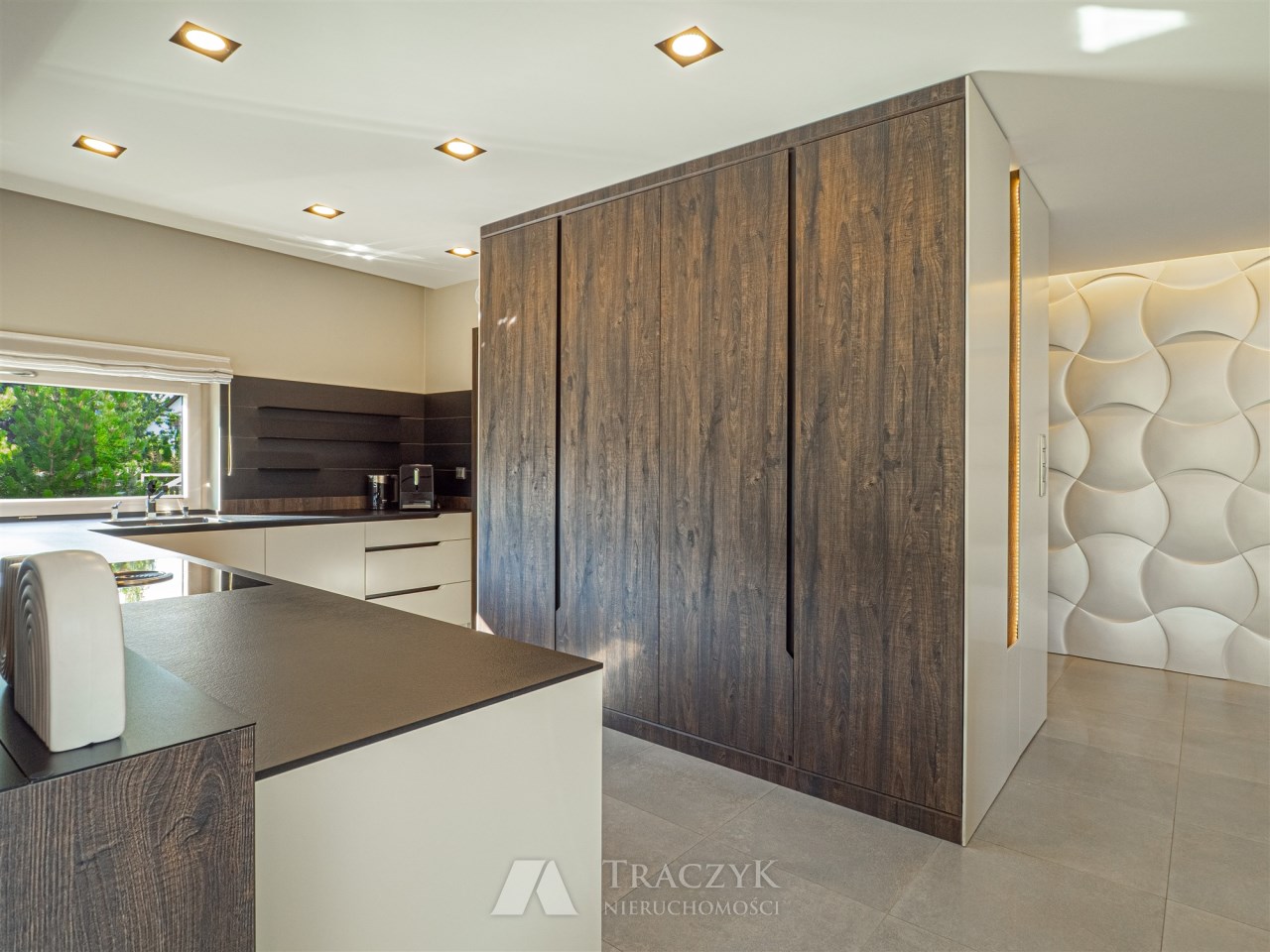 Kuchnia z fornirowaną zabudową, wyposażona w wysokiej jakości sprzęt agd - Siemens, Bosch, Bora.