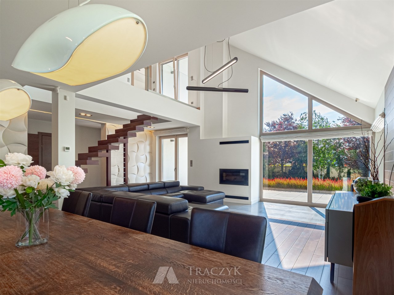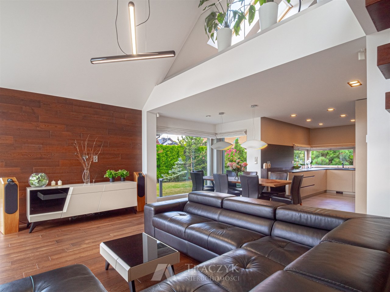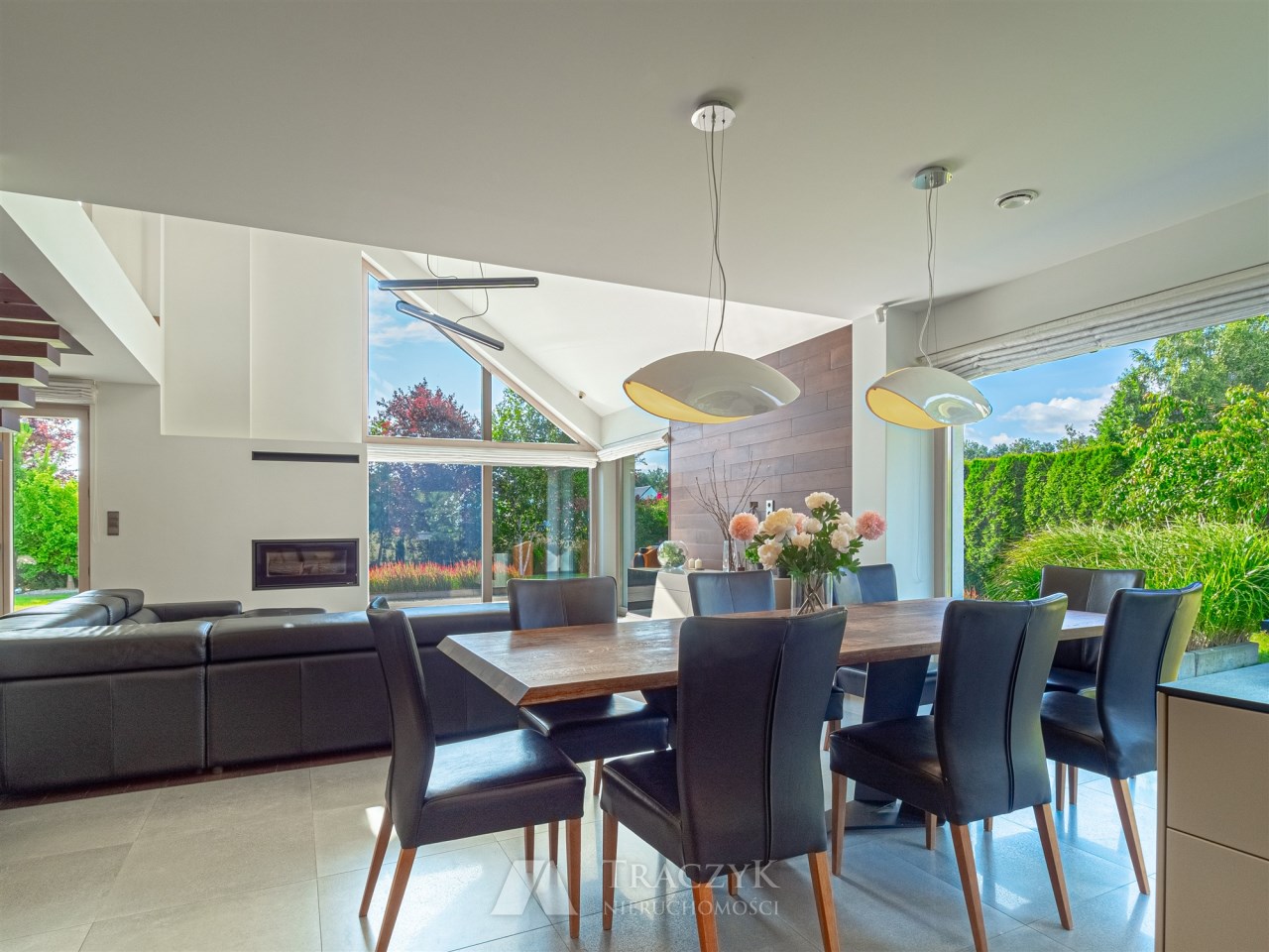 Salon z sufitem katedralnym, kominkiem i przeszkleniami z widokiem na zielony dojrzały ogród. W salonie na wyposażeniu pozostaje narożna skórzana sofa.