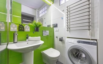 Wyposażenie łazienki kabina prysznicowa, lustro, natrysk, pralka, prysznic, umywalka, WC