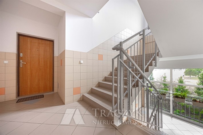 Klatka schodowa widna, czysta i zadbana. Wejście zabezpieczone domofonem.