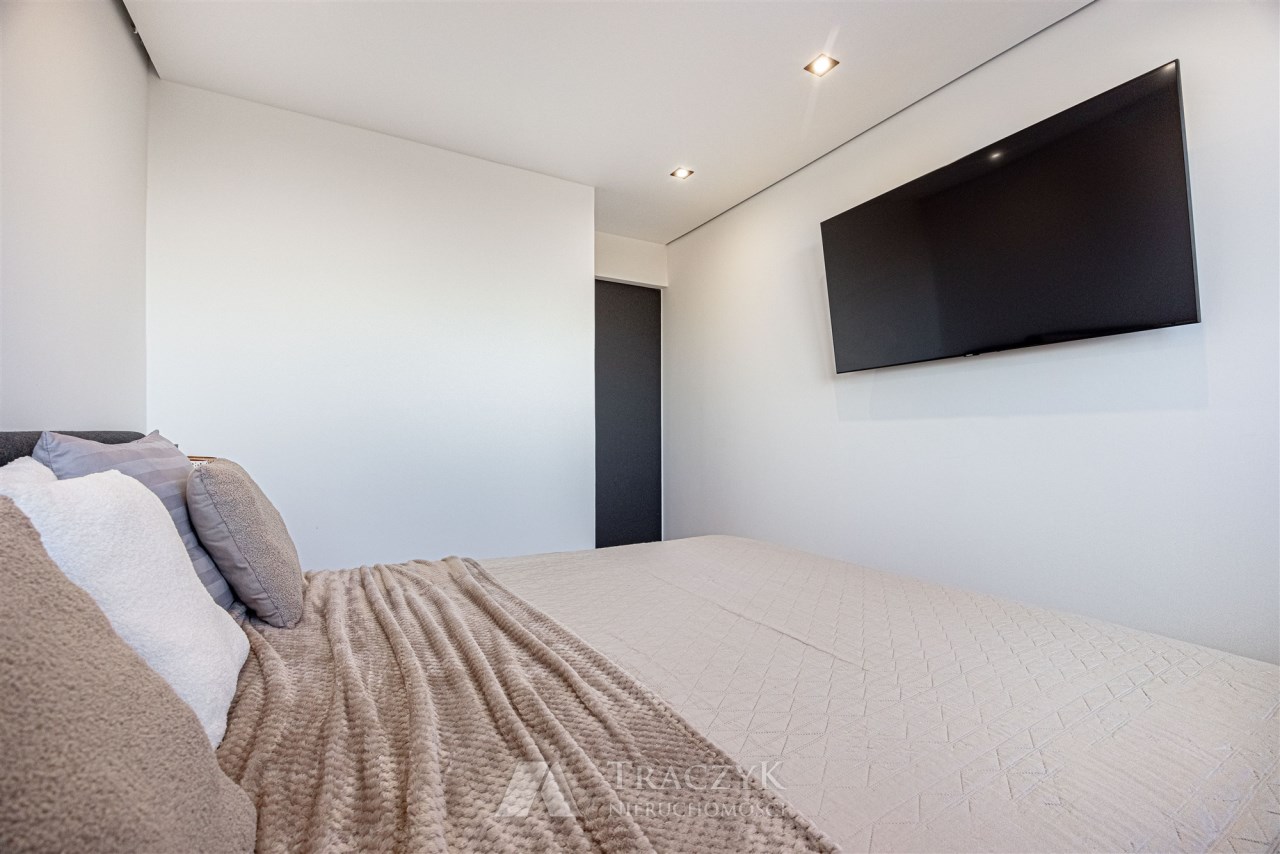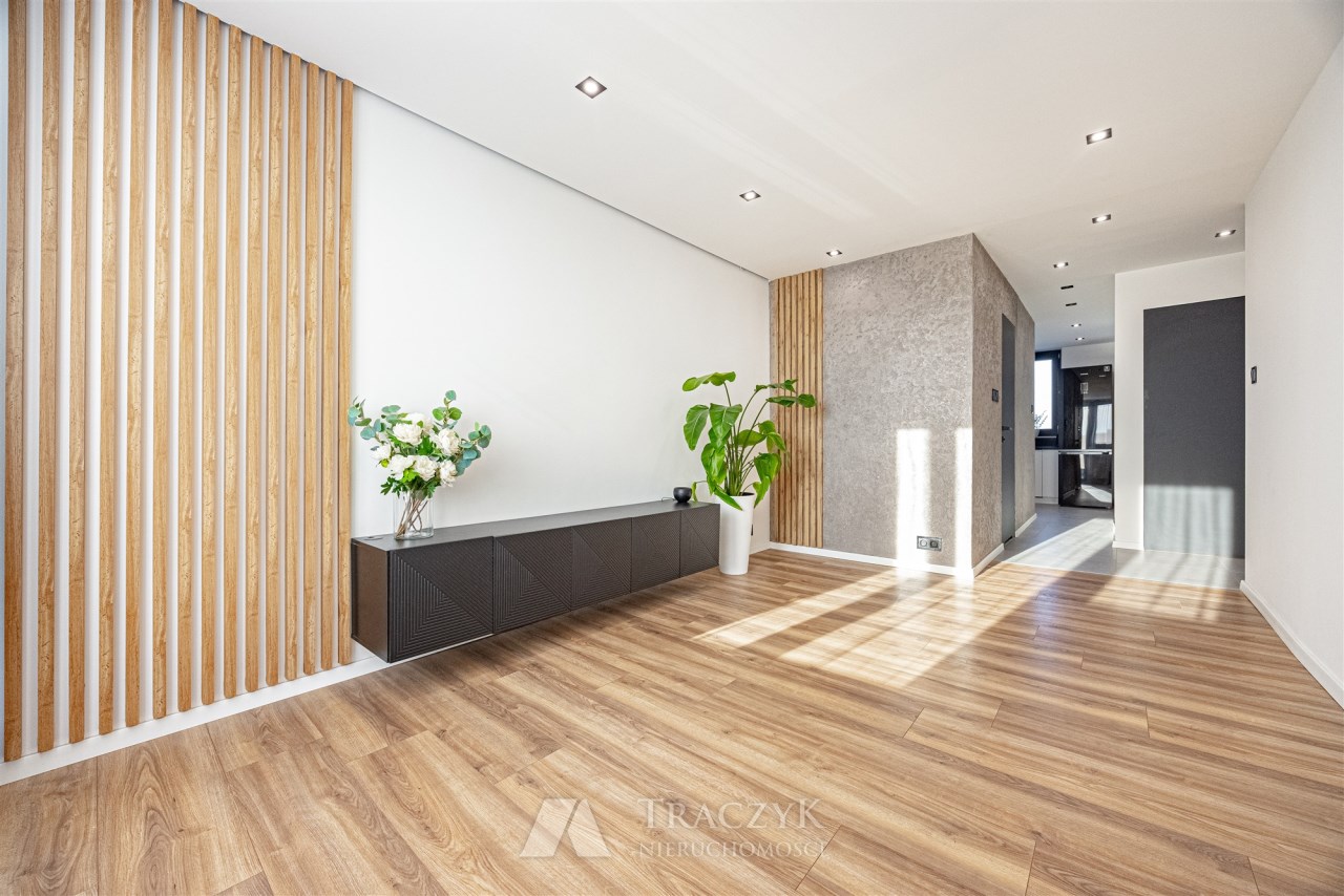 • Nowoczesne wykończenie premium – m.in. hiszpańskie płytki, trzyszybowe okna, matowe fronty, betonowe parapety