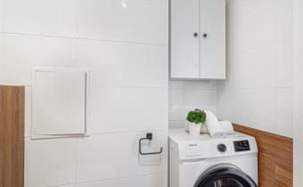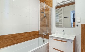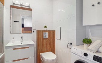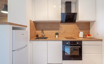 - kuchnia wyposażona w meble w zabudowie oraz sprzęt AGD (piekarnik, zmywarka, indukcyjna płyta grzewcza, lodówko-zamrażarka),