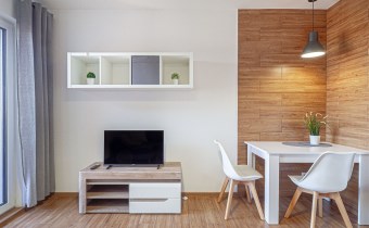 - salon wyposażony w rozkładaną sofę z funkcją spania, stół z krzesłami, stolik kawowy, półki, stolik telewizyjny wraz z TV oraz szafę ubraniową w zabudowie,