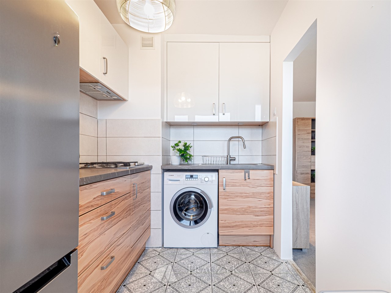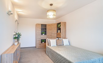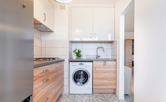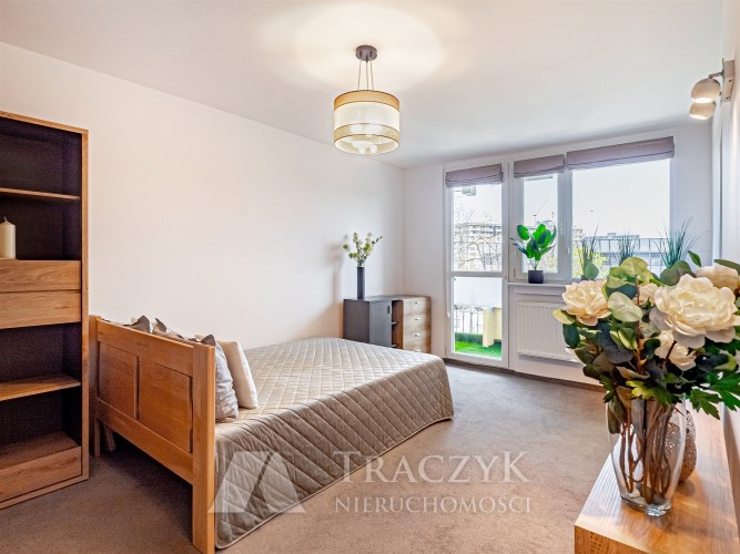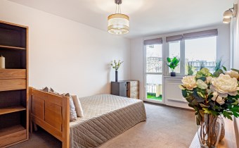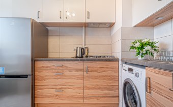 Mieszkanie jest w pełni umeblowane. Na dwudziestu sześciu metrach kwadratowych mamy pokój z wyjściem na balkon, wyposażony w podwójne łóżko z materacem, narożną szafę, komodę i regał. W osobnej kuchni mamy pełnowymiarową lodówkę, zabudowę meblową, pralkę, kuchenkę oraz wolnostojący piekarnik.