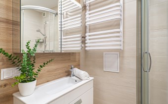 Łazienka jest połączona z WC i wyposażona w prysznic.