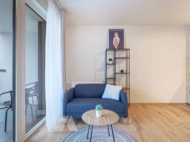 - dobrze oświetlonego salonu wyposażonego w regał, stolik kawowy oraz sofę. Z salonu wyjście na przestronny balkon (6,18m2).