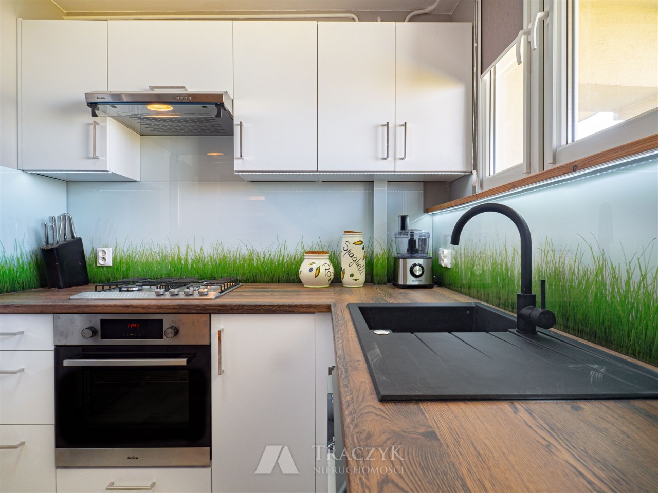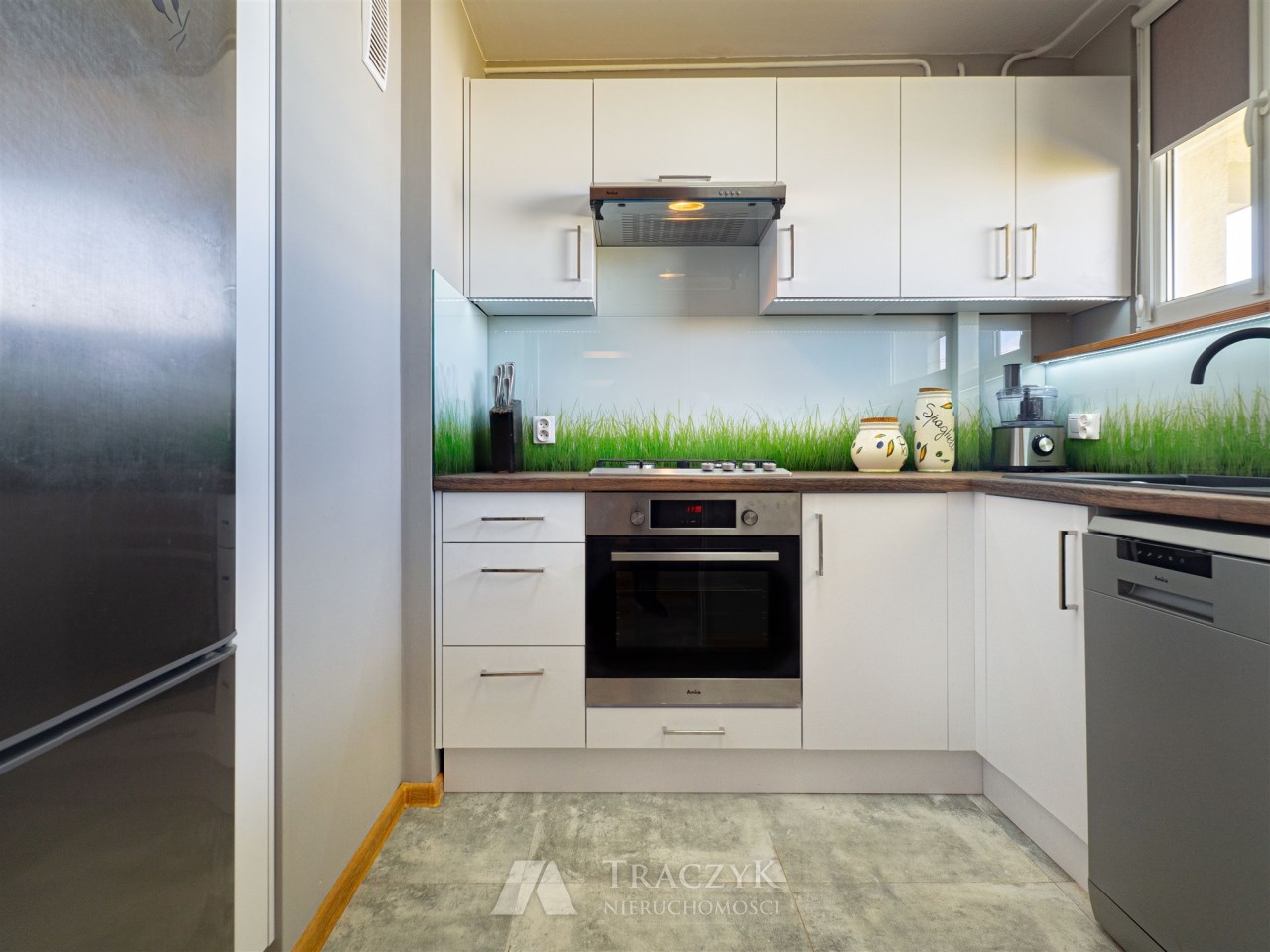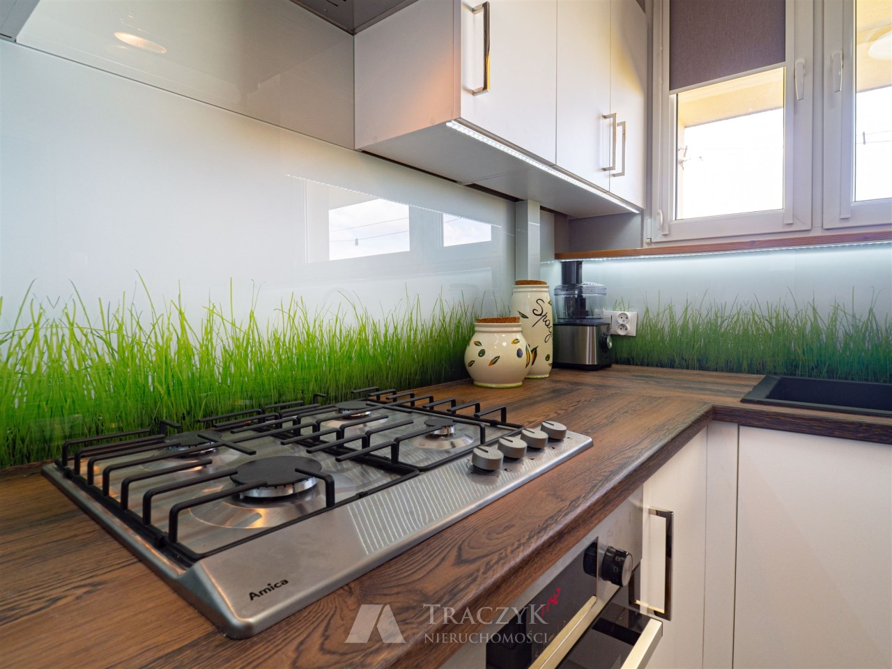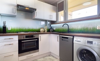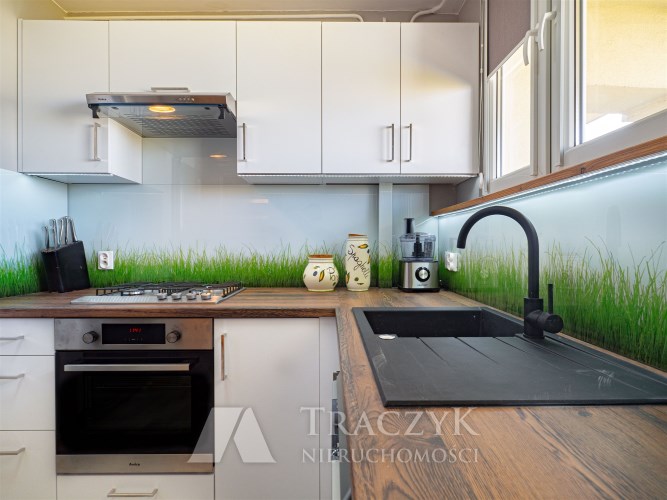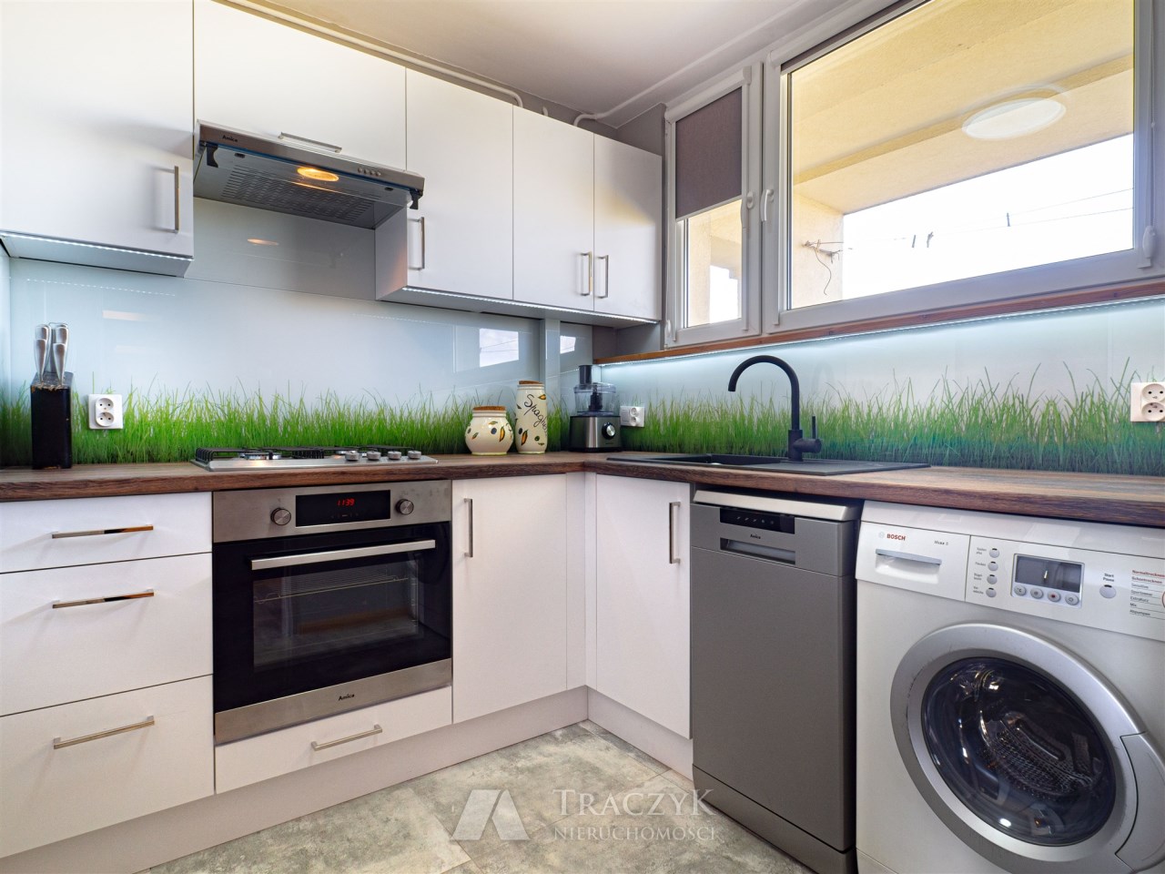- kuchnia jasna z oknem, w której znajdują się meble na wymiar oraz sprzęty AGD jak: lodówko-zamrażarka w zabudowie marki Mastercook, wbudowany piekarnik elektryczny AMICA, płyta gazowa AMICA, zmywarka AMCIA, pralka BOSCH, okap AMICA oraz bogate drobne wyposażenie (zastawa stołowa, sztućce, zestaw garnków, dwie sokowirówki Cookworks i Blaupunkt, wyciskarka do owoców, itp.). Zarówno meble kuchenne, jak i sama wyspa ofertują dużą ilość miejsca do przechowywania,