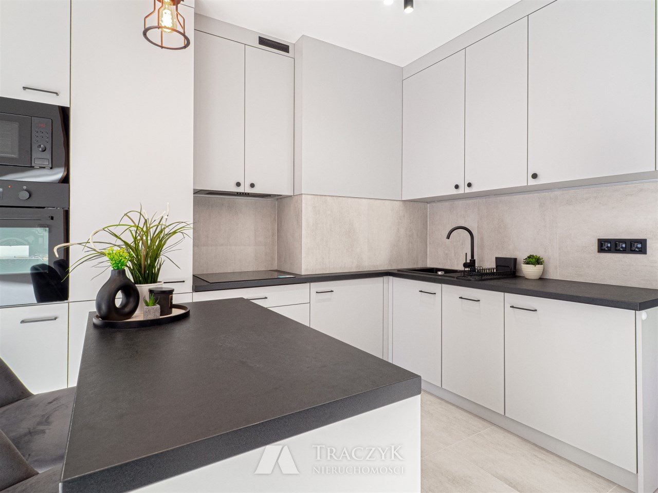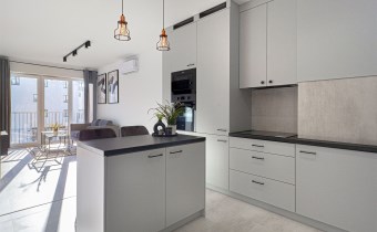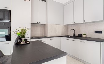 - aneksu kuchennego z wyspą oraz z dużą ilością szafek do przechowywania sprzętów kuchennych . Aneks kuchenny wyposażony został we wszystkie niezbędne sprzęty AGD: lodówko-zamrażalkę w zabudowie, indukcję, piekarnik, zmywarkę. W aneksie również pralka.