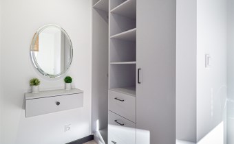 - przytulnej sypialni z łóżkiem podwójnym. Na oknach zamontowane są rolety. W sypialni znajduje się również garderoba z toaletką i lustrem.