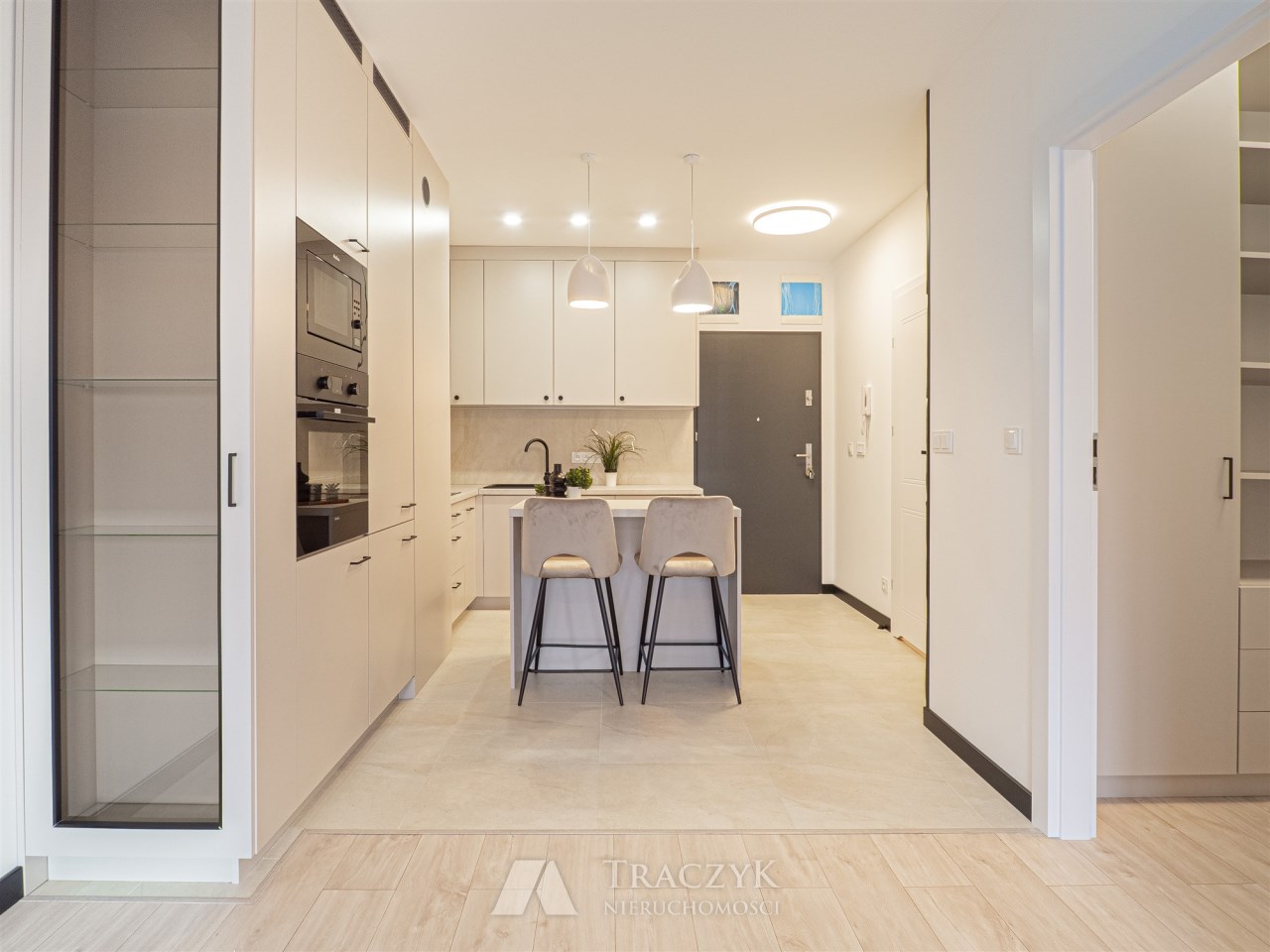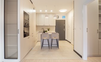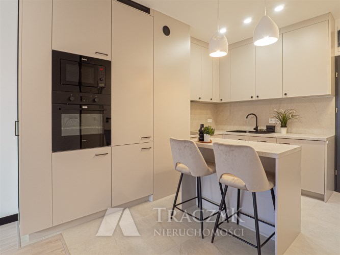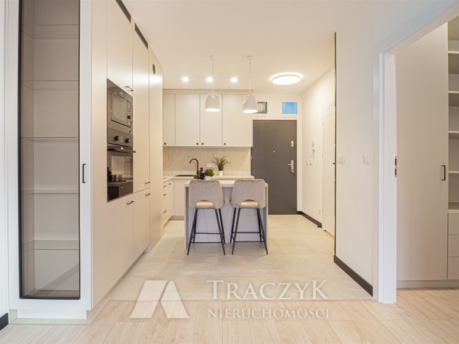 - aneksu kuchennego z wyspą oraz z dużą ilością szafek do przechowywania sprzętów kuchennych . Aneks kuchenny wyposażony został we wszystkie niezbędne sprzęty AGD: lodówko-zamrażalkę w zabudowie, indukcję, piekarnik, zmywarkę. W aneksie również pralka.
