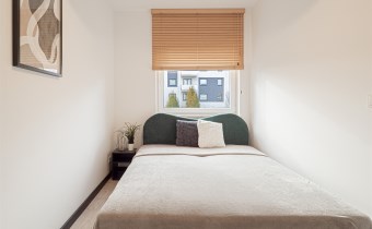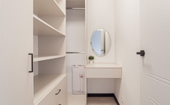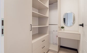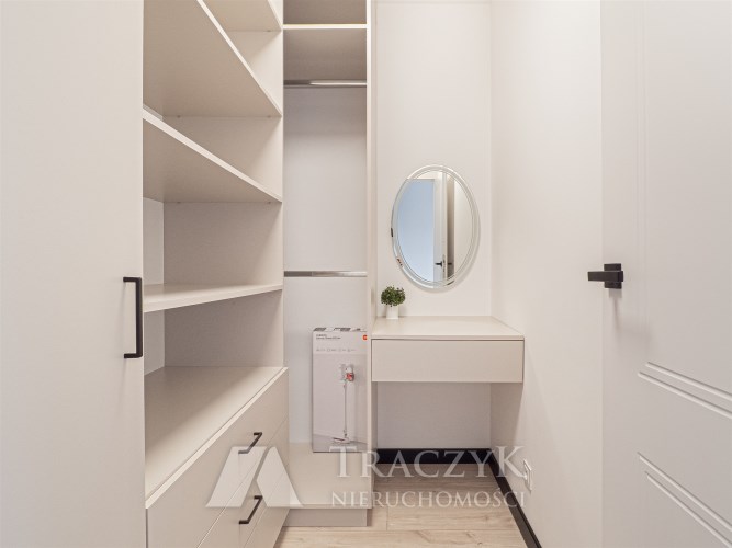 - przytulnej sypialni z łóżkiem podwójnym. Na oknach zamontowane są rolety. W sypialni znajduje się również garderoba z toaletką i lustrem.