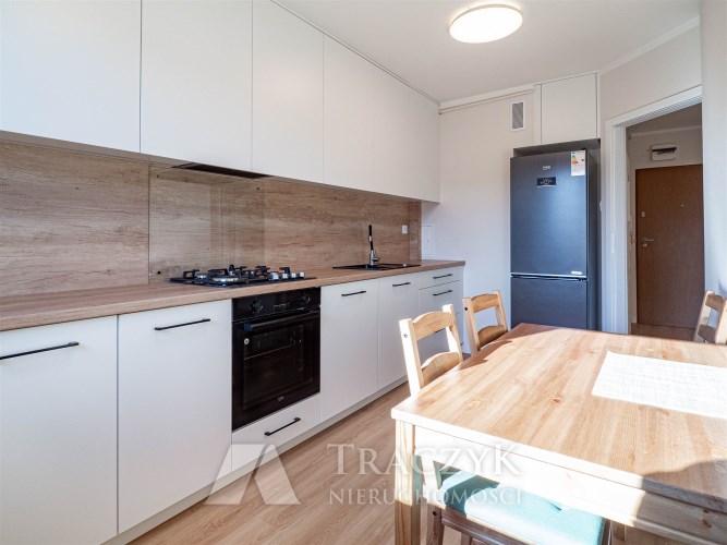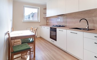 • Kuchnia: przestronna z pełnym wyposażeniem, z meblami w zabudowie, piekarnikiem, zmywarką, płytą kuchenną, okapem kuchennym, lodówką z zamrażarką oraz stołem dla czterech osób,