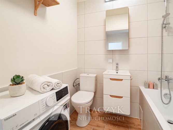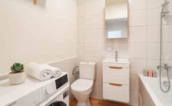 • Łazienka: funkcjonalna łazienka z WC, wanną, umywalką z szafką oraz oświetloną lustrzaną szafką. W łazience znajduje się także pralka,