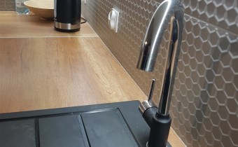Kuchnia w zabudowie wykonana na zamówienie, całkowicie wyposażona w niezbędny nowoczesny sprzęt AGD, zmywarkę, mikrofalówkę, akcesoria kuchenne, talerze itp.