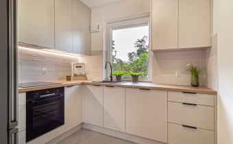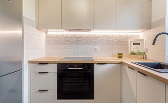 - osobna kuchnia wyposażona w meble kuchenne oraz nowoczesny sprzęt AGD: płytę indukcyjną, piekarnik elektryczny, okap kuchenny, lodówko-zamrażarkę, zmywarkę,