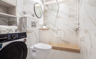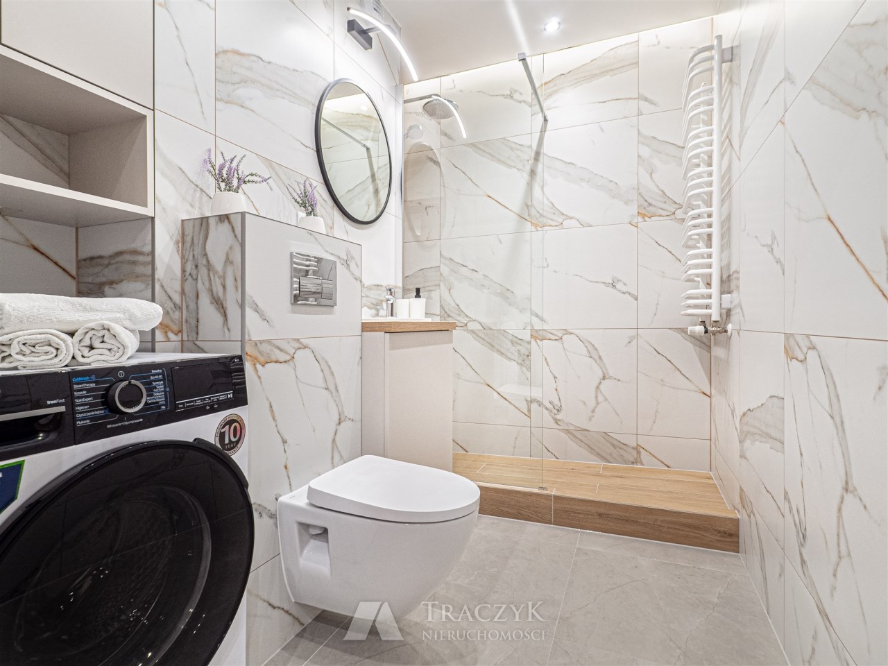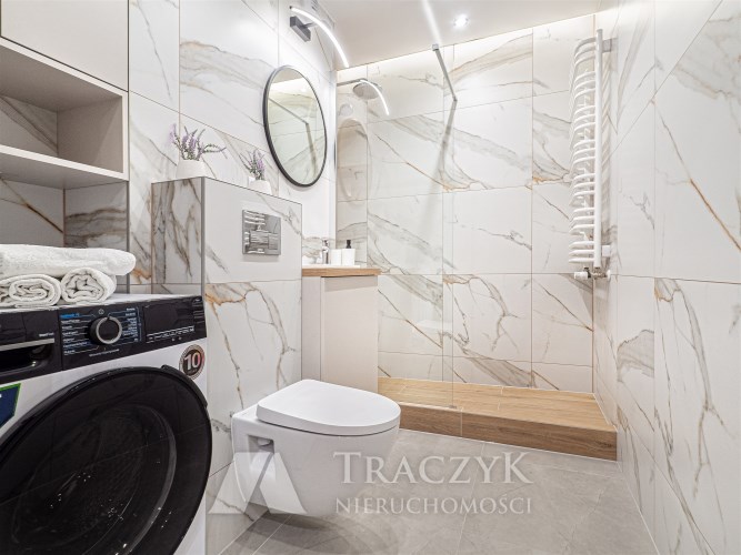 - łazienka z prysznicem, lustrem, umywalką, nowoczesną pralką i szafkami do przechowywania,