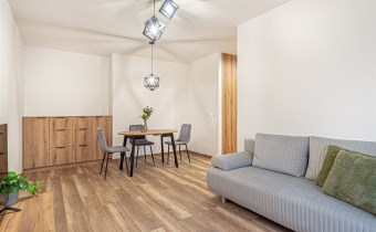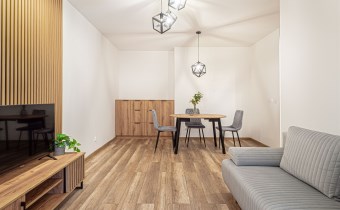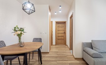 - przestronny salon wyposażony w nowoczesne meble takie jak: w części jadalnianej - stół z krzesłami i komoda, w części dziennej - wygodna rozkładana sofa, stolik RTV z telewizorem,
