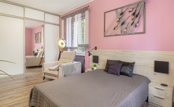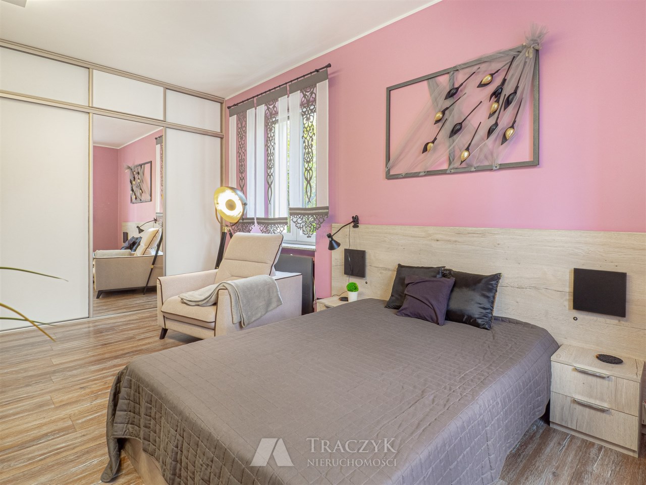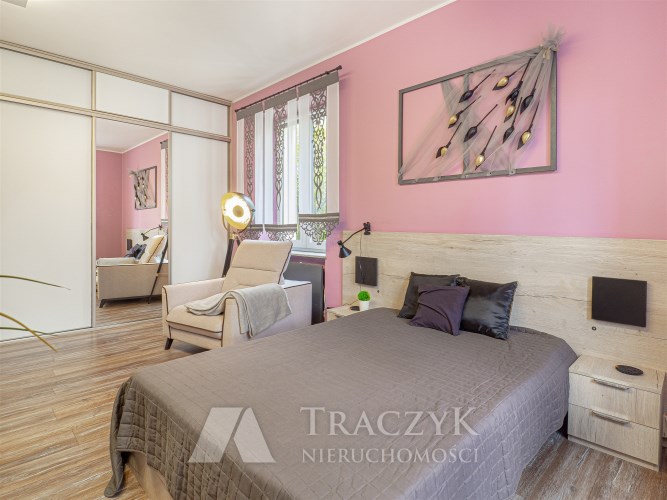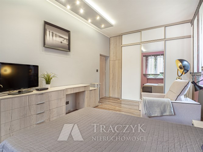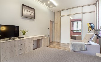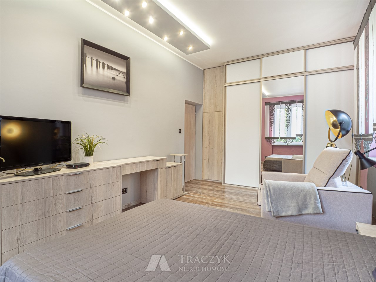 - Sypialnia: wyposażona w duże łóżko, pojemną zabudowaną szafę, komody, TV i inne meble.