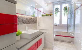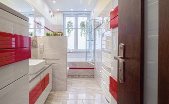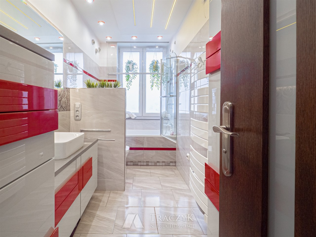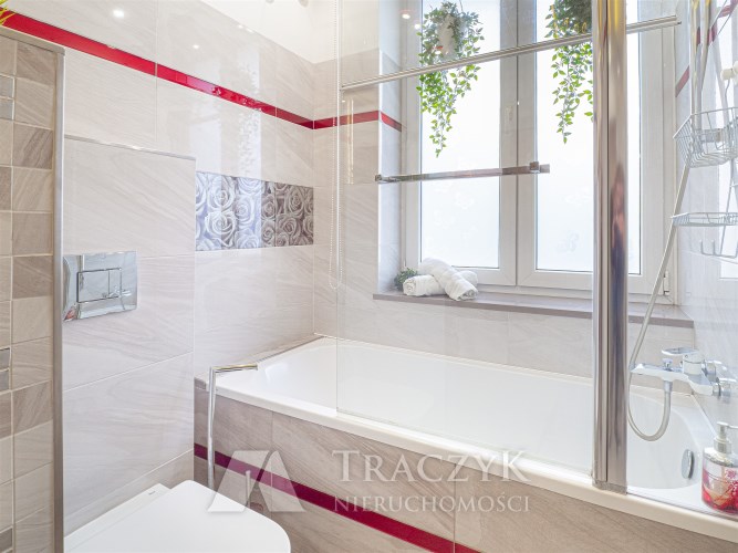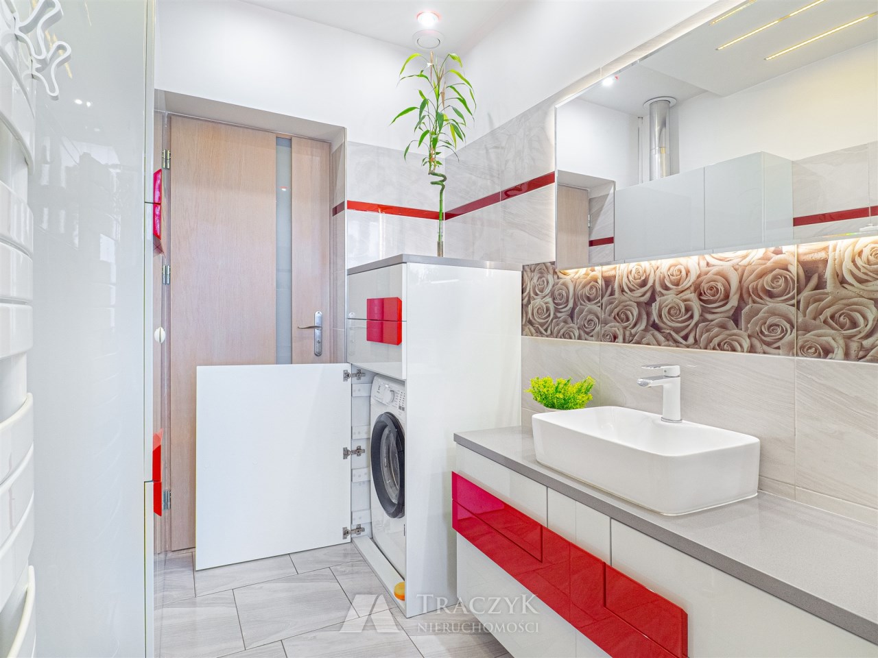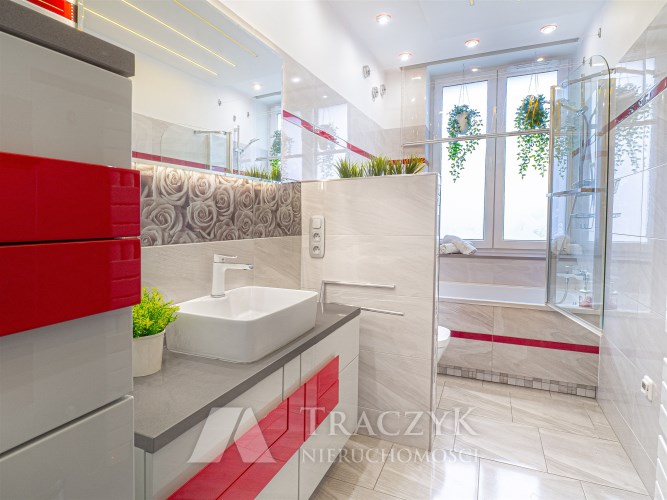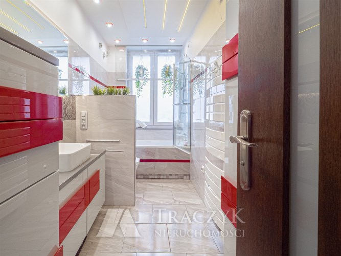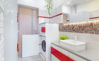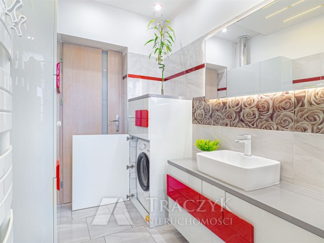 - Łazienka: z wanną, WC, umywalką z podświetlanym lustrem oraz pralką.