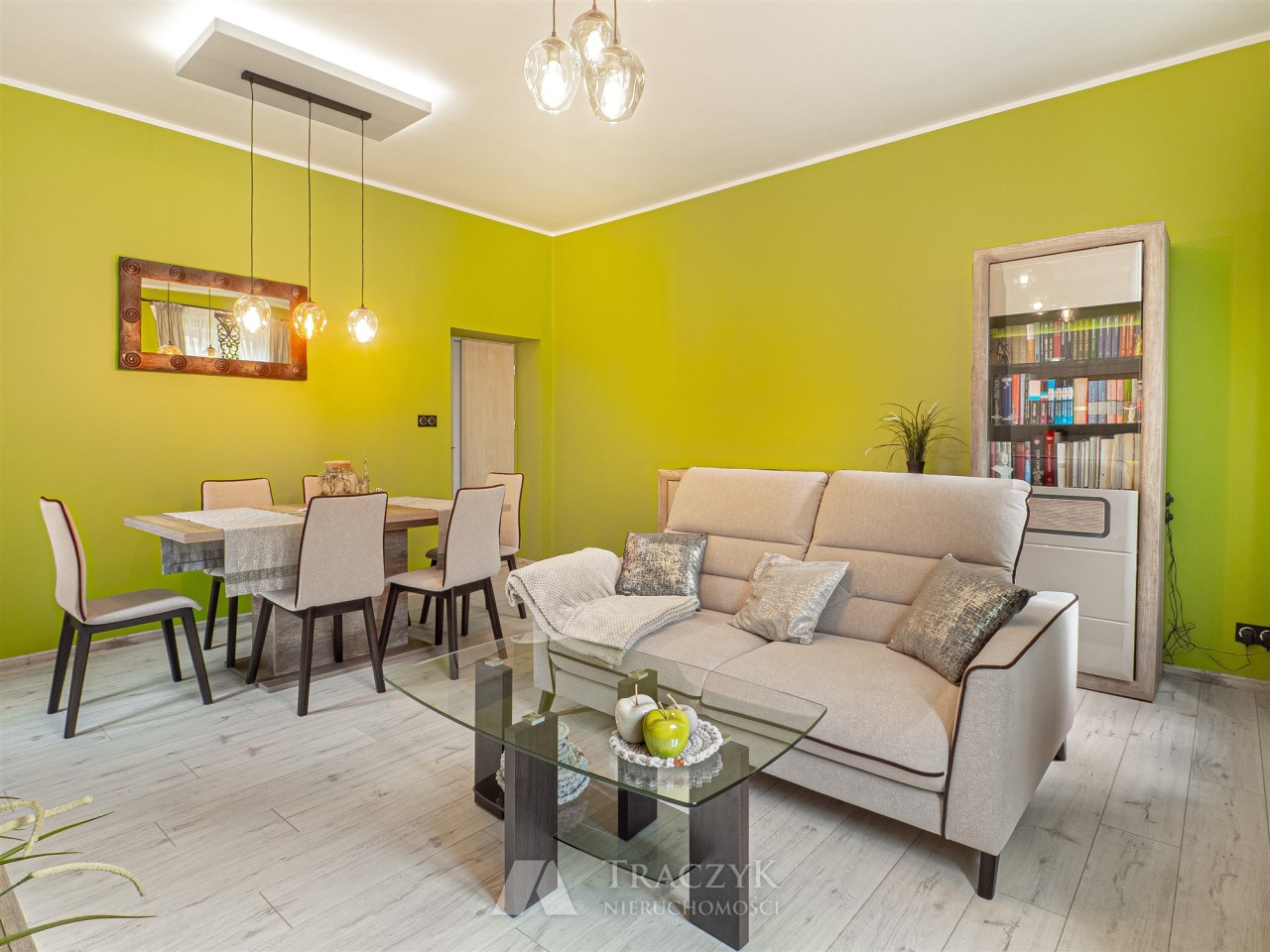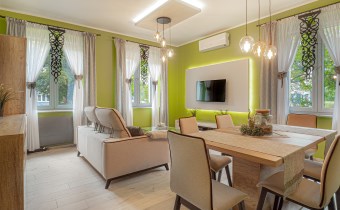 - Salon: przestronny, z dużym jadalnianym stołem, wygodną kanapą, regałem na książki, szafką pod TV oraz telewizorem.