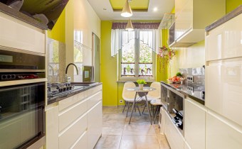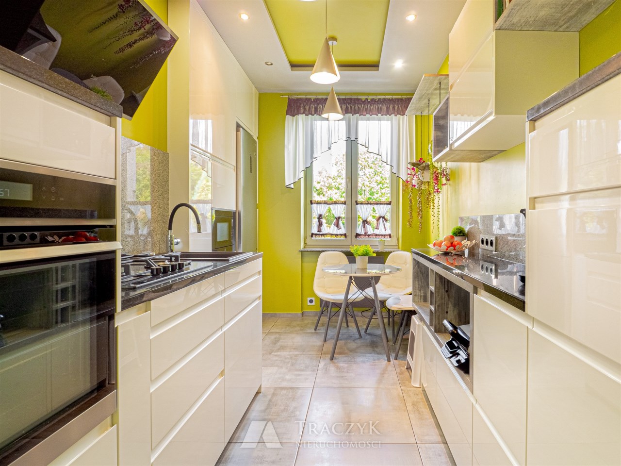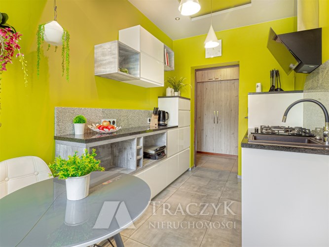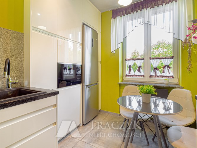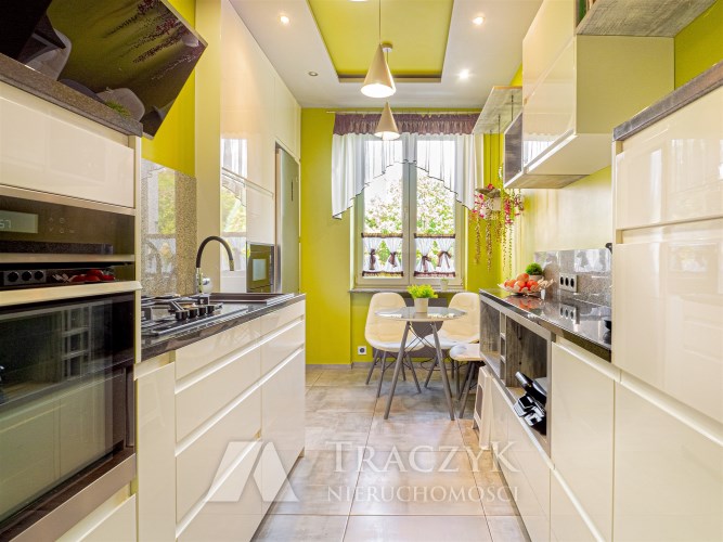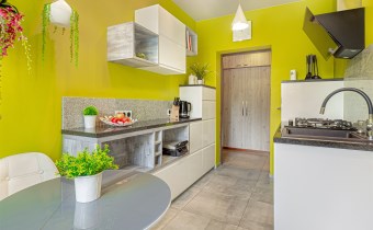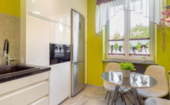 - Kuchnia: oddzielna, w pełni wyposażona w sprzęty AGD (lodówka, piekarnik, kuchenka, zmywarka), stolik z krzesłami oraz liczne szafki.