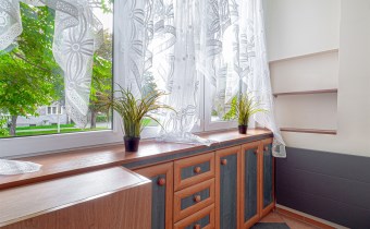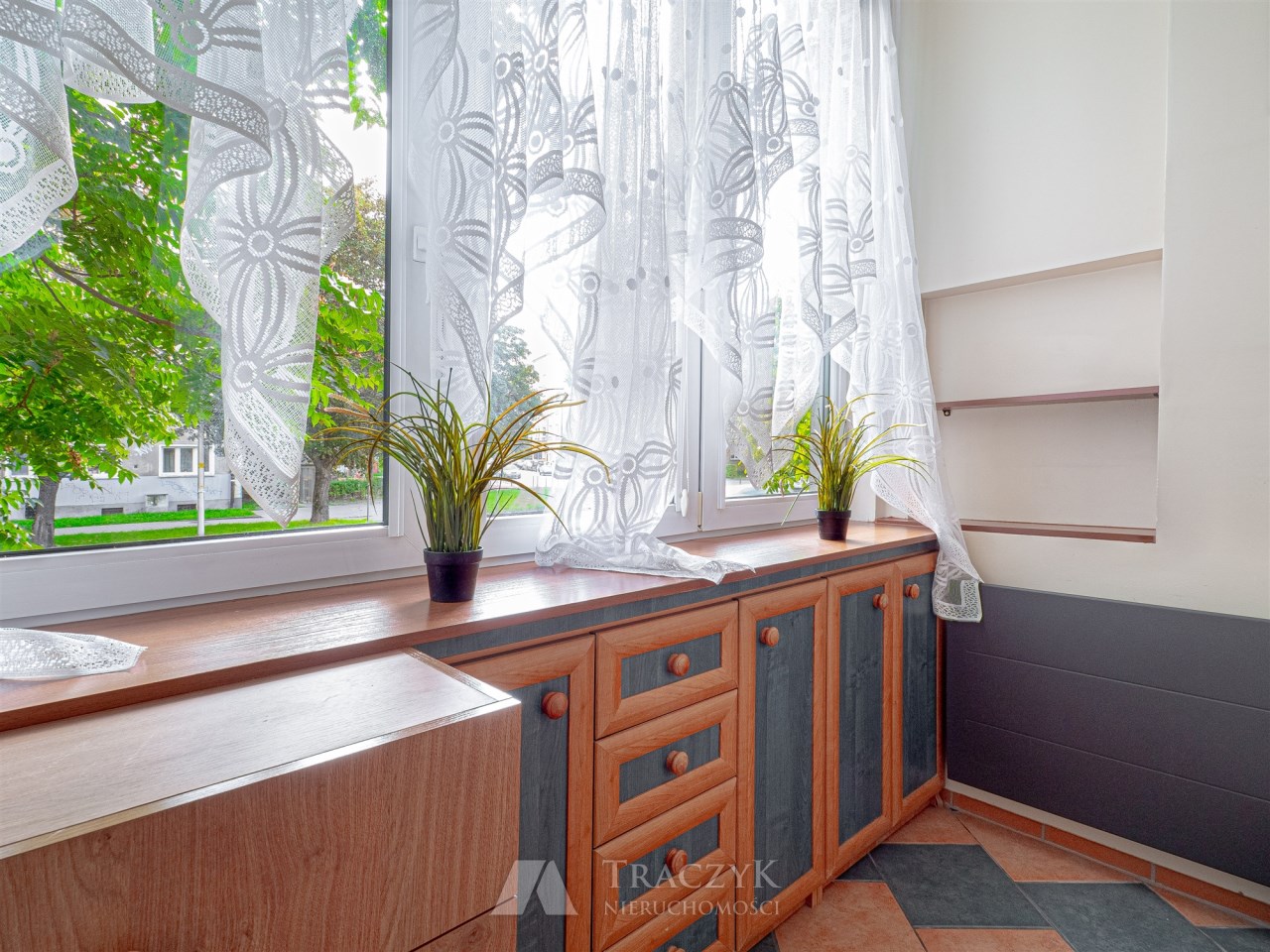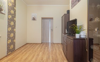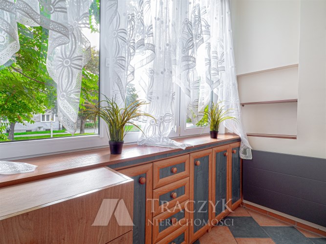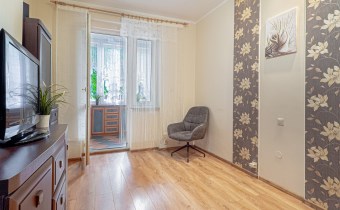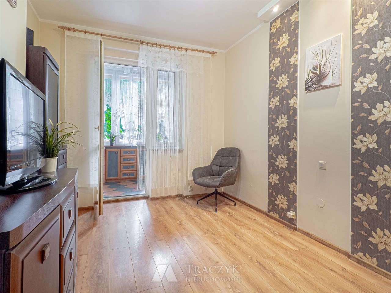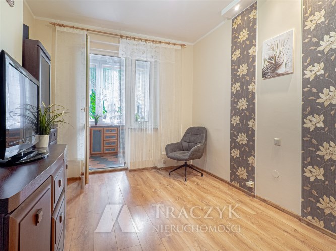 - Pokój: idealny do pracy zdalnej, z regałem, komodą, TV oraz wyjściem na zabudowaną loggię, która oferuje dodatkową przestrzeń do przechowywania rzeczy.
