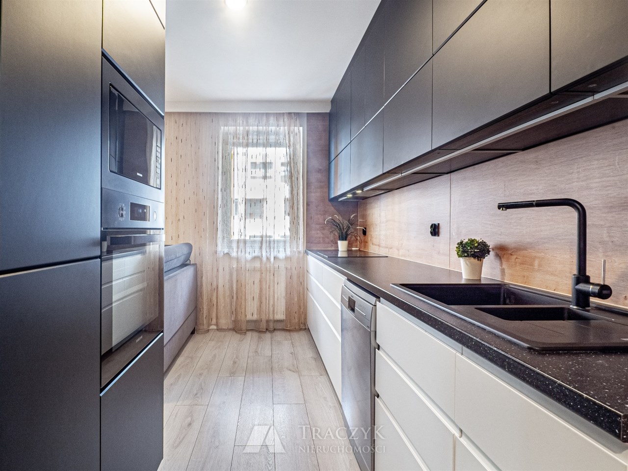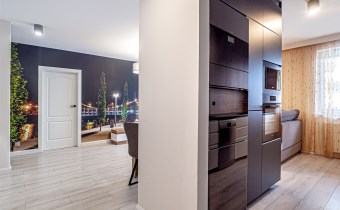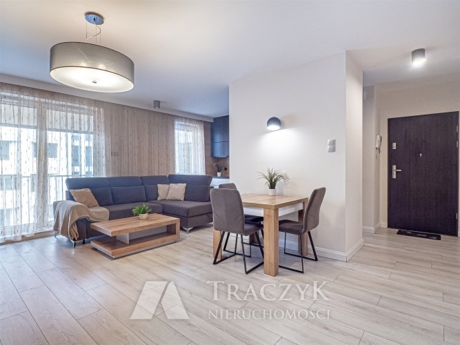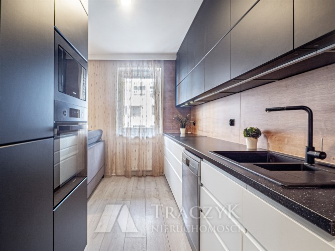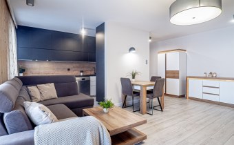 - przestronnego salonu z aneksem kuchennym – salon wyposażony w wygodny, rozkładany narożnik, stół z krzesłami, komodę oraz szafkę RTV (meble z podświetleniem). Z salonu wyjście na balkon. Aneks kuchenny z podświetlanymi szafkami, w pełni wyposażony w wysokiej jakości sprzęty marki Samsung: lodówkę z zamrażarką, mikrofalówkę i piekarnik w zabudowie oraz zmywarkę. Duża ilość miejsca do przechowywania. Na wyposażeniu również podstawowe przybory kuchenne (garnki, sztućce, talerze itp.),