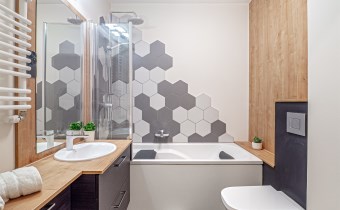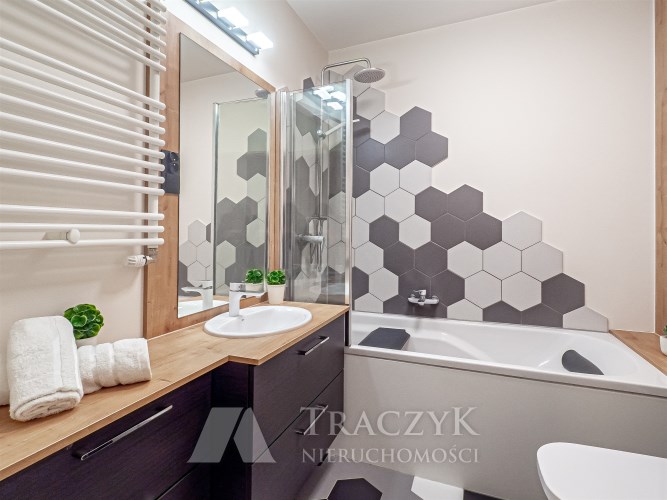 - łazienka z WC – wanna z funkcją prysznica, toaleta oraz szafki.