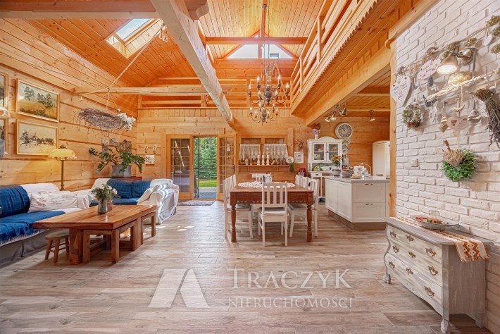 Ta niezwykła nieruchomość łączy w sobie solidność tradycyjnego rzemiosła z komfortem nowoczesnych rozwiązań. Wnętrza emanują ciepłem naturalnego drewna, tworząc atmosferę sprzyjającą relaksowi i poczuciu bliskości z naturą. To dom, który wyróżnia się nie tylko architekturą, ale również klimatem – idealny dla osób poszukujących unikalnej przestrzeni do życia.