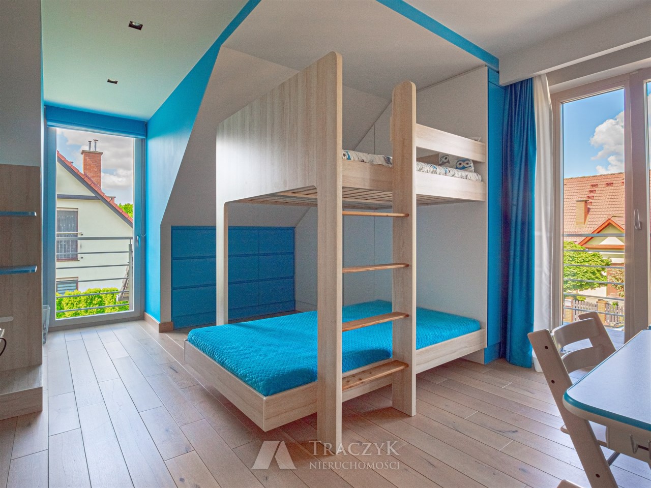 Dwie sypialnie dziecięce z zabudową meblową z laminatu.