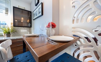 - Spacious Living Room – Designed in a modern, classic style, creating a perfect space for relaxation, family gatherings, and everyday comfort. The cozy seating area with a comfortable sofa, an elegant dining table with upholstered chairs, modern chandeliers, and wall sconces enhance the warm and sophisticated ambiance. Large windows provide plenty of natural light, and the balcony offers direct outdoor access. The living room is equipped with air conditioning for year-round comfort, as well as thoughtfully placed decor and a large wall mirror that visually enlarges the space.