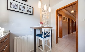 - Functional Kitchen with Dining Area – A modern, bright kitchen featuring wooden cabinets, white upper cupboards, and a stone countertop, adding elegance and warmth to the space. Equipped with high-quality built-in appliances (oven, induction hob, extractor hood, and a large fridge-freezer) to ensure convenience while cooking. The L-shaped layout offers ample storage space. The dining area includes a stylish breakfast bar with designer chairs, perfect for morning coffee or quick meals. Hanging pendant lights with warm illumination add to the cozy atmosphere.
