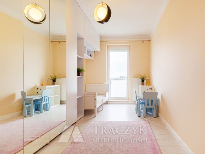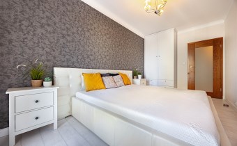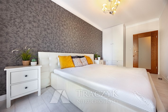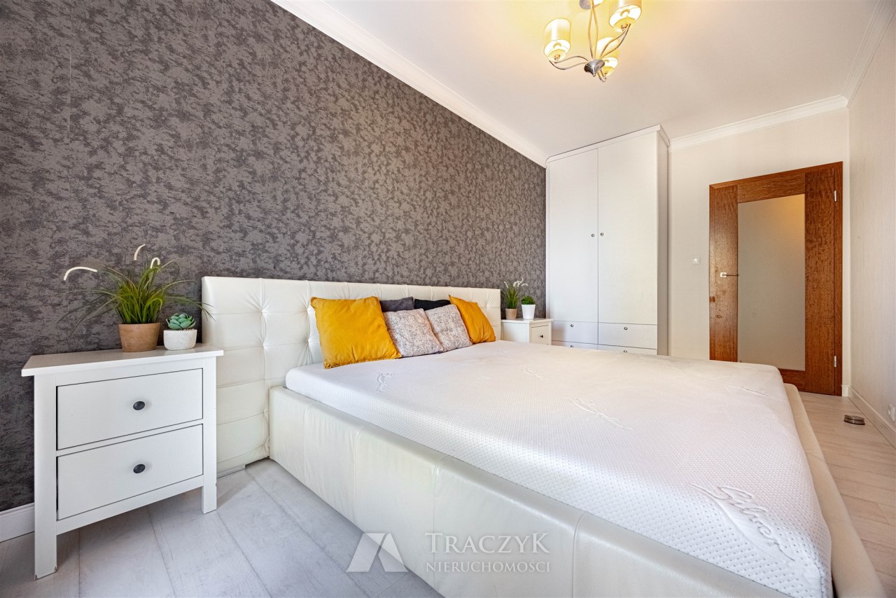 Sypialnia - urządzona z dbałością o komfort i estetykę, stanowi idealne miejsce do odpoczynku i relaksu. Połączenie jasnych tonacji z kontrastową tapetą dodaje wnętrzu elegancji, pojemna szafa oferuje mnóstwo miejsca do przechowywania, duże, wygodne łóżko z tapicerowanym wezgłowiem zapewni komfortowy sen. Z sypialni również istnieje możliwość wyjścia na balkon.