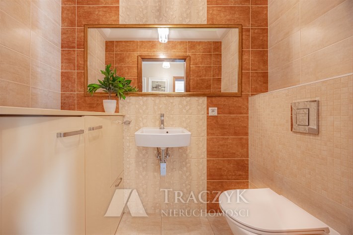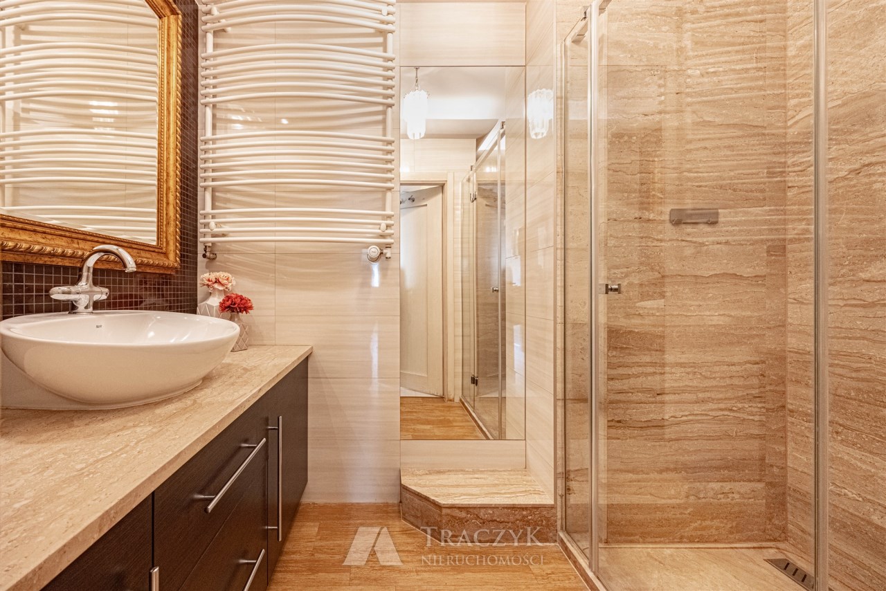 Łazienka- zaprojektowana z dbałością o detale, łącząc estetykę z wygodą użytkowania. Z jasnymi, ciepłymi odcieniami beżu i naturalnego kamienia, które nadają wnętrzu przytulności i elegancji.Nowoczesna kabina prysznicowa z dużym, przeszklonym wejściem i odpływem liniowym, która zapewniająca komfort codziennego użytkowania. Stylowa umywalka nablatowa osadzona na szerokim blacie z naturalnego kamienia zapewnia dużo miejsca do przechowywania kosmetyków i akcesoriów. Pod blatem znajduje się pojemna szafka w ciemnym odcieniu drewna, idealna na dodatkowe akcesoria łazienkowe.