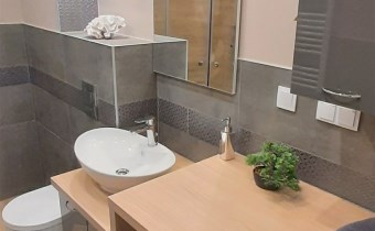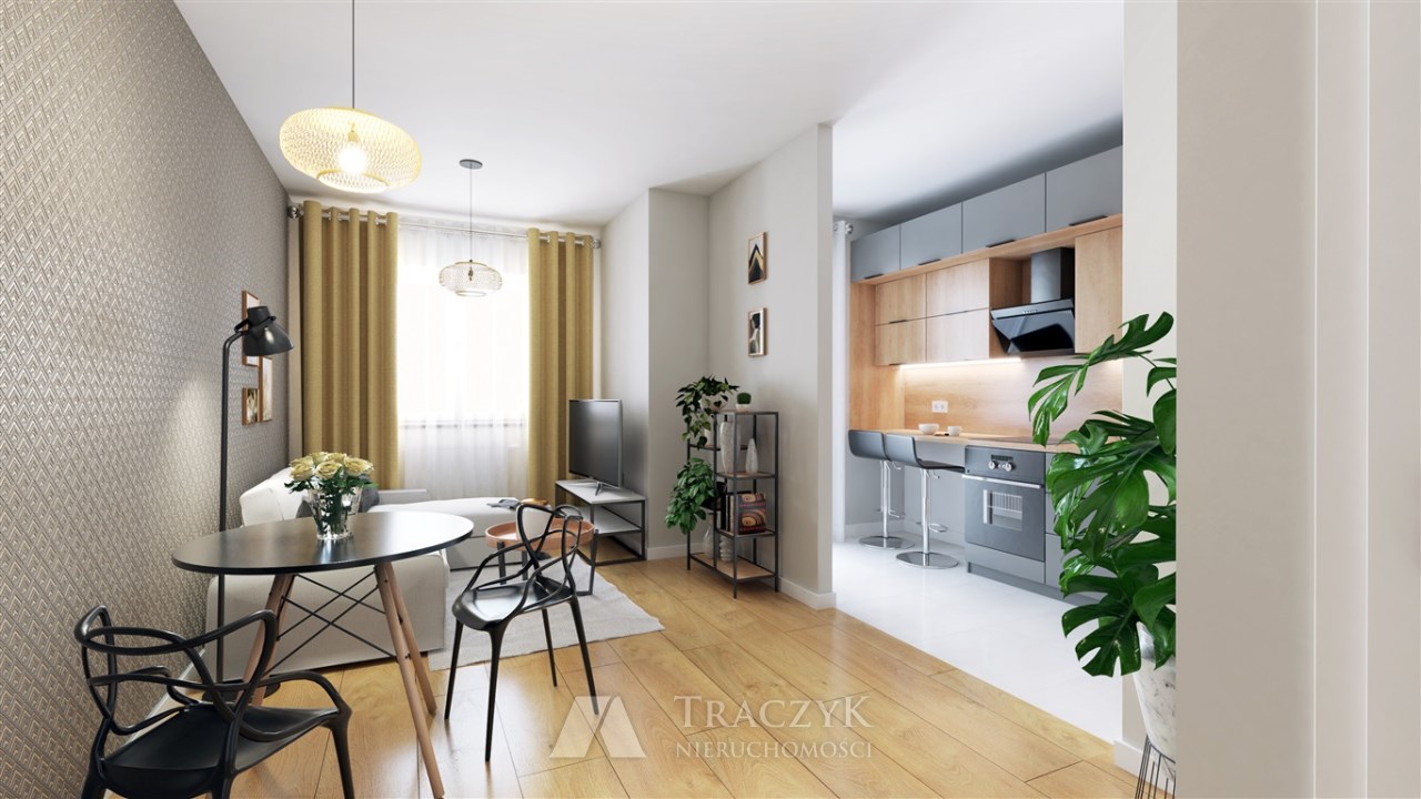 Mieszkanie składa się z przedpokoju, 1 pokoju z półotwartą kuchnią oraz gotową wykończoną łazienką wyposażoną w kabinę prysznicową, umywalkę, szafki oraz toaletę (dodatkowo przygotowane podłączenie pod pralkę). Brak zabudowy kuchennej.