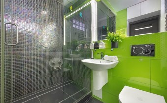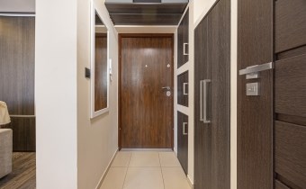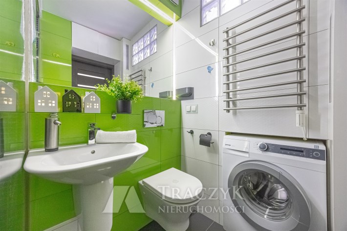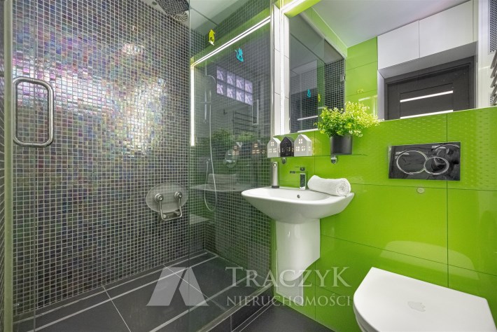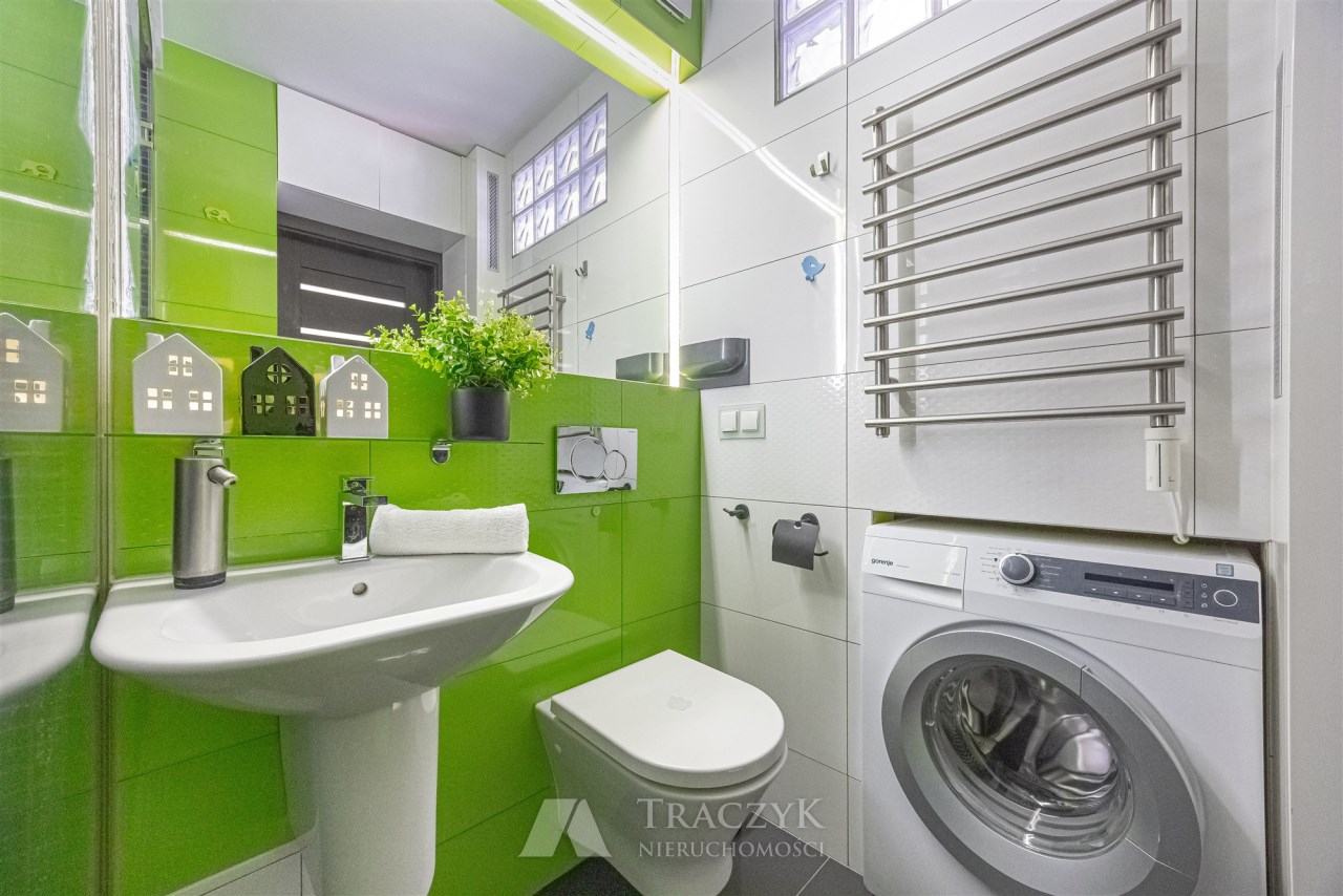 Łazienka, mimo niewielkiego metrażu, została zaaranżowana bardzo praktycznie — wyposażono ją w saunę parową, co stanowi niezwykle rzadki i luksusowy dodatek w tej klasie nieruchomości.