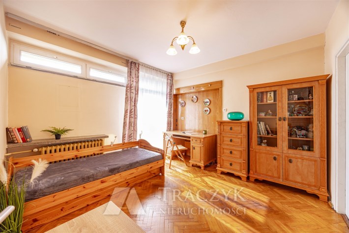 Możliwość wyjścia na balkon jednocześnie z dwóch pokoi. Na uwagę zasługuje także drewniany parkiet w jodełkę.