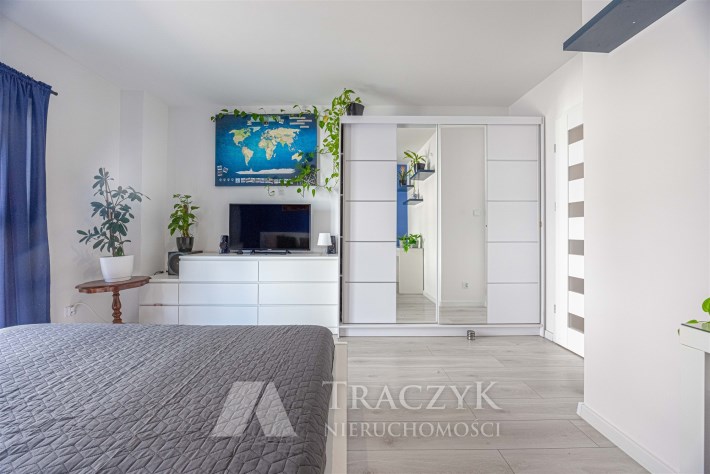 Całe mieszkanie zostało wykończone z dbałością o detale – na podłogach położono gres w odcieniach drewna oraz panele w nowoczesnej, szarej kolorystyce. Zamontowano nową stolarkę drzwiową, a w oknach i drzwiach tarasowych zainstalowano zewnętrzne żaluzje, które zapewniają komfort, prywatność i bezpieczeństwo.
