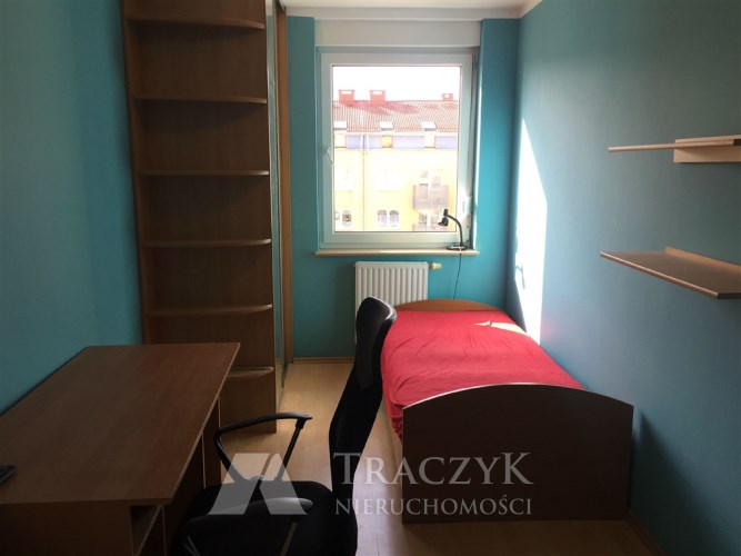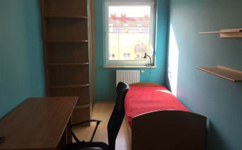 Pokój 2: łóżko jednoosobowe, szafa, biurko z krzesłem.