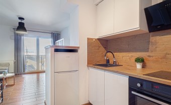 - kuchnia wyposażona w meble w zabudowie oraz sprzęt AGD (piekarnik, zmywarka, indukcyjna płyta grzewcza, lodówko-zamrażarka),