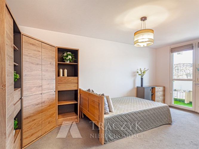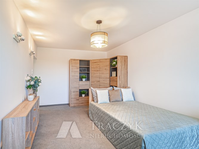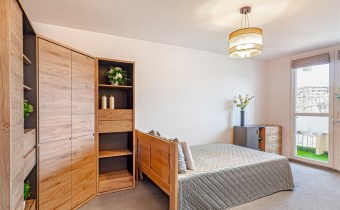 Mieszkanie jest w pełni umeblowane. Na dwudziestu sześciu metrach kwadratowych mamy pokój z wyjściem na balkon, wyposażony w podwójne łóżko z materacem, narożną szafę, komodę i regał. W osobnej kuchni mamy pełnowymiarową lodówkę, zabudowę meblową, pralkę, kuchenkę oraz wolnostojący piekarnik.