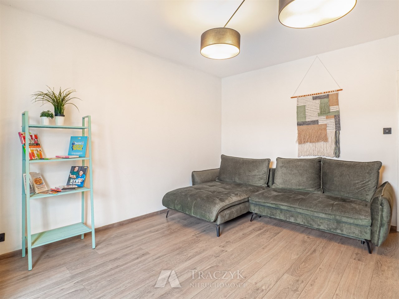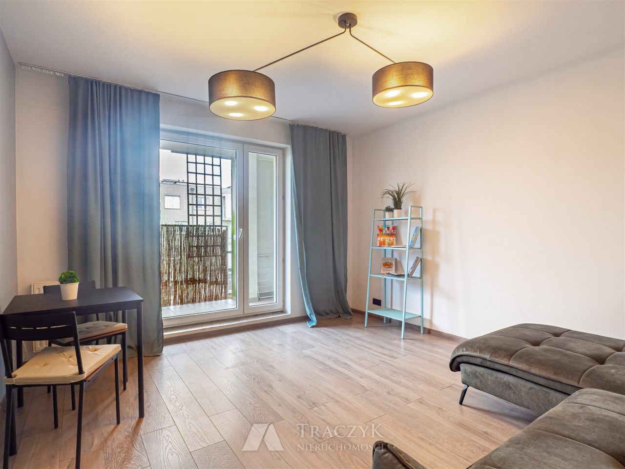 • salon z wyjściem na balkon: duża, wygodna sofa, stół z krzesłami oraz regał na książki,