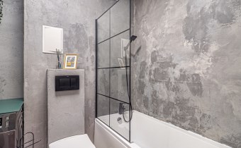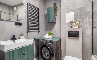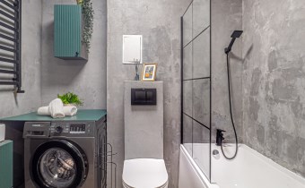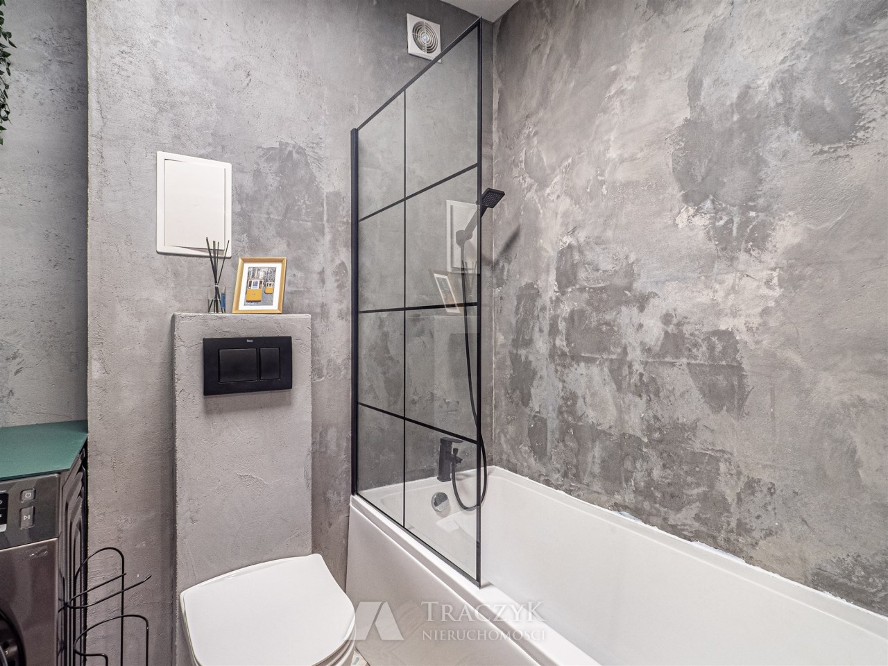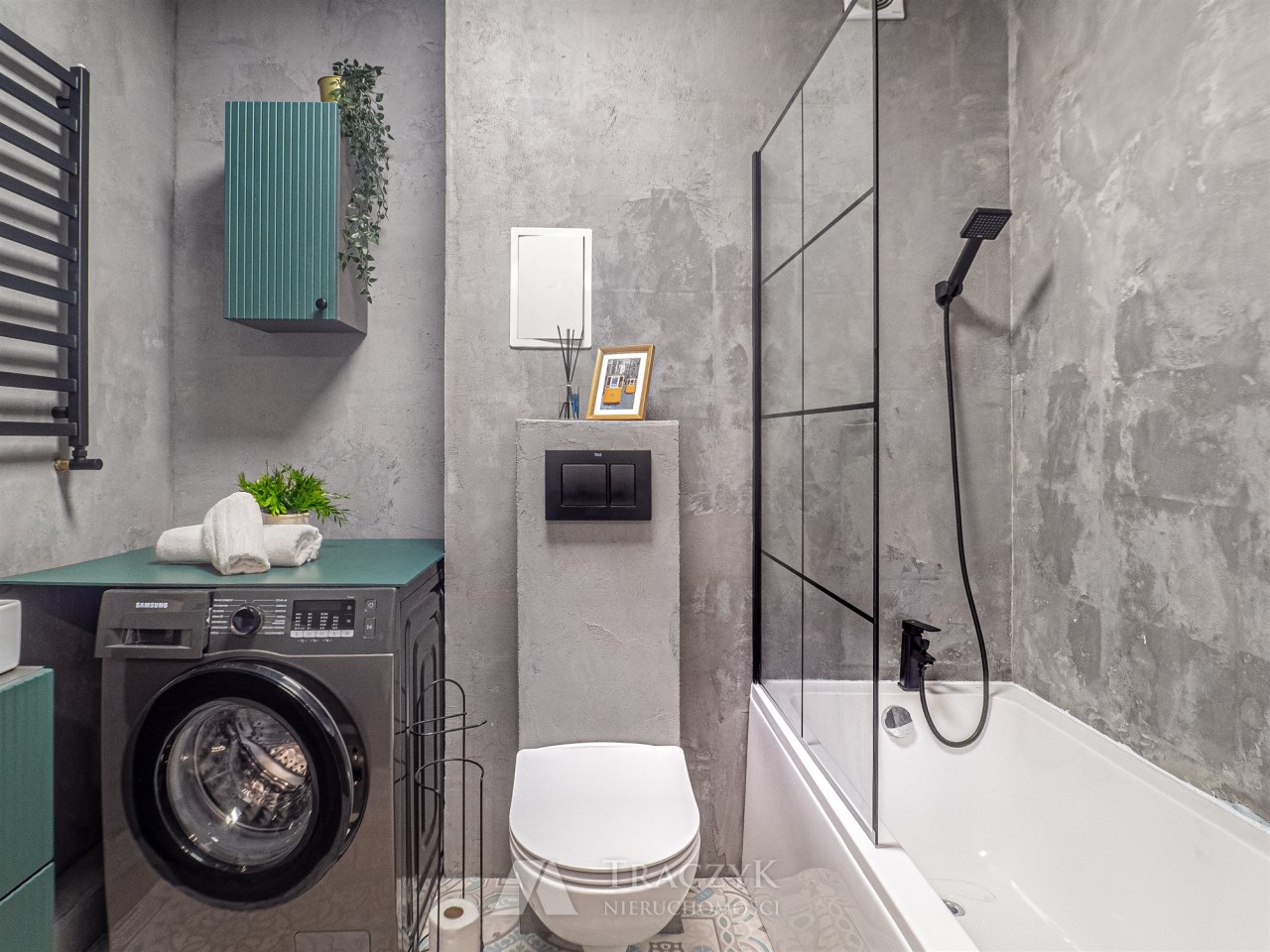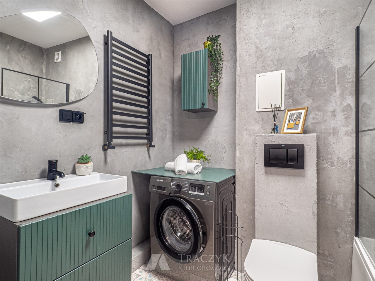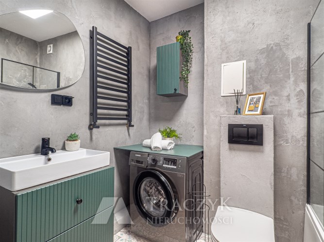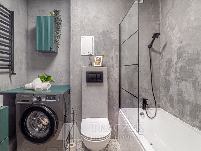 • łazienka z WC: wanna, pralka, szafka oraz lustro.