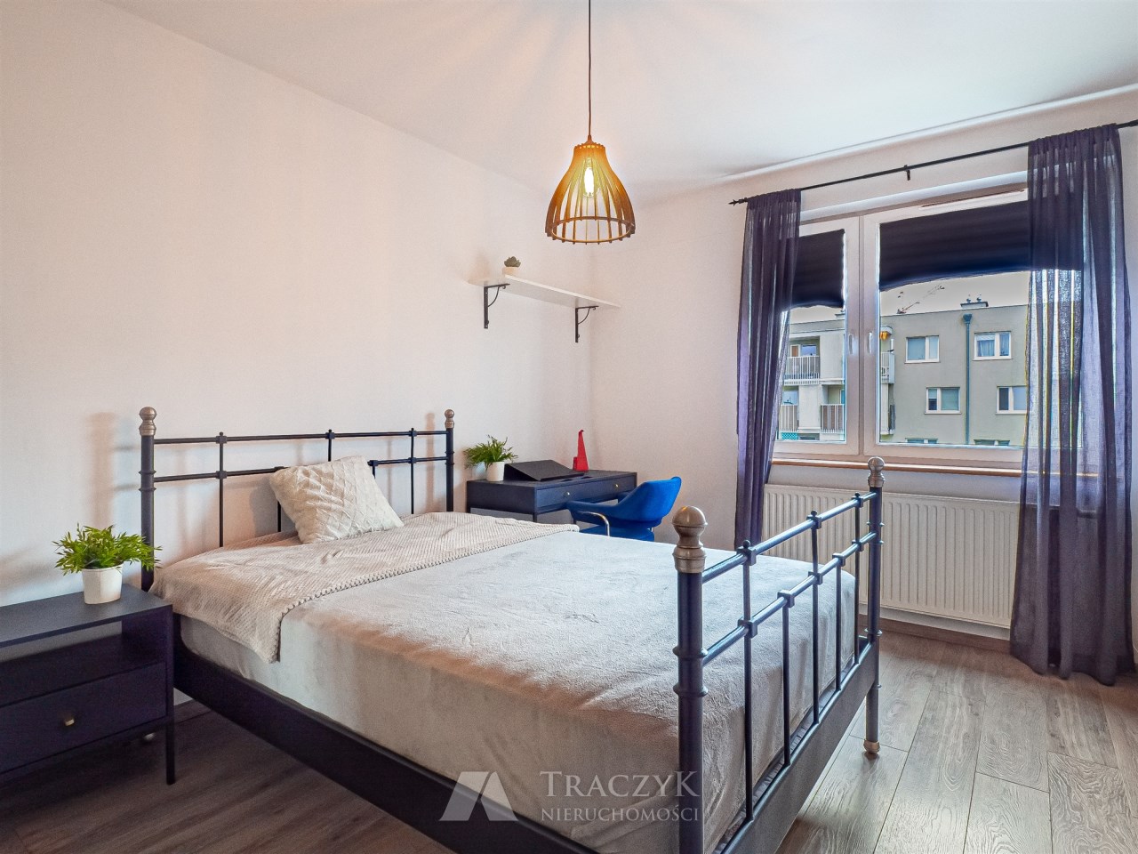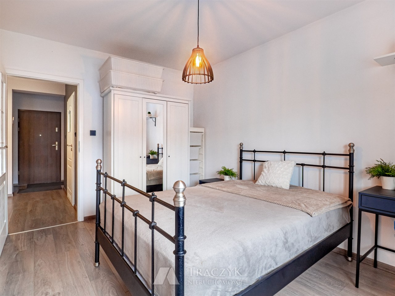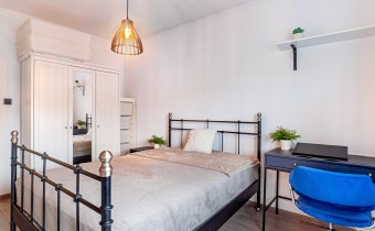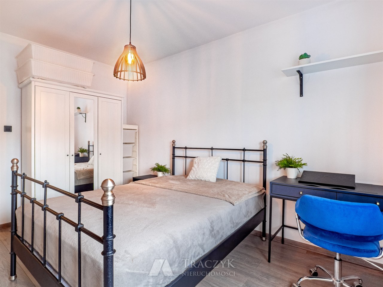 • sypialnia: duże łóżko z materacem, szafa z lustrem oraz biurko,